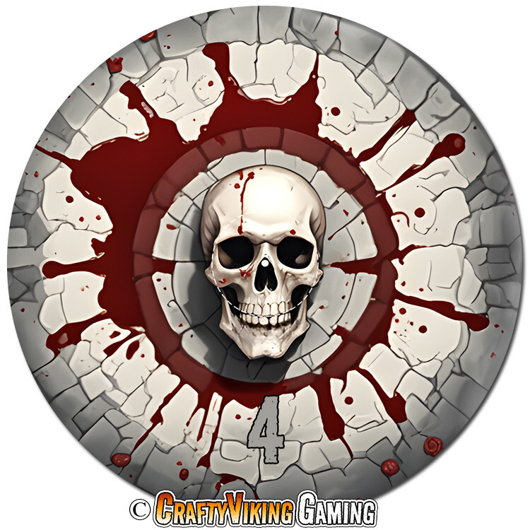 Blood Bath Set of 6 objective markers for Warhammer 40K and Age of Sigmar 4th Edition . This set features a bloody dungeon with skulls. Numbered 1-6 40 mm (marked center circle) for simple measuring plus 3 inches to the edge Total diameter 192 mm or 7.57 inches 2 mm thin neoprene (mouse-pad) material Non-slip rubber backing Enhance your gaming experience with these high quality attractive objective markers. No more guessing if a model is in range. Thanks for shopping & happy gaming!