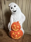 Blow Mold Halloween lighted Ghost with Pumpkins newly made using the original Grand Venture mold. Lighted with a bright LED bulb. Stands 31” inches tall. Great look. Made in the U.S.A. Look over pictures to help with description. Thanks. Shipped UPS or Fed Ex. No PO Box shipping.