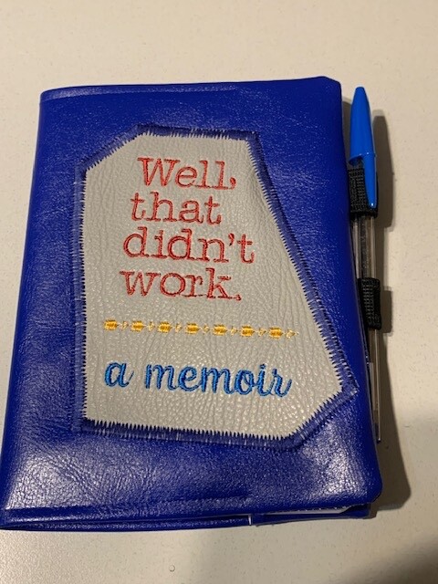 NEW: 5" x 7" lined notebook, pen in a Royal Blue faux leather cover. Cover design is embroidered on gray textured faux leather "Well, that didn't work. a memoir" - embroidery done in red, blue yellow. Elastic loops hold the pen and keep the notebook closed. gift humor composition book lined blank Embroidered and Sewn in my studio in Missouri USA, ready to ship. Will mail out within 24 hours of completed order, USPS mail.