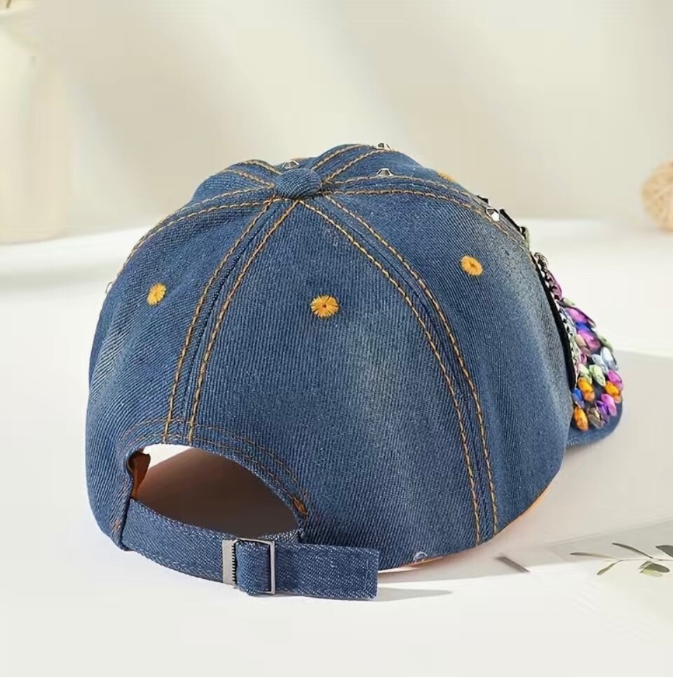 Baseball Cap. Women’s Blue Denim Cap with large Rhinestones and Studs. Spell out “QUEEN”. 100% cotton. Adjustable SnapBack