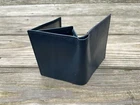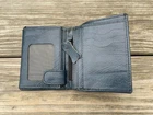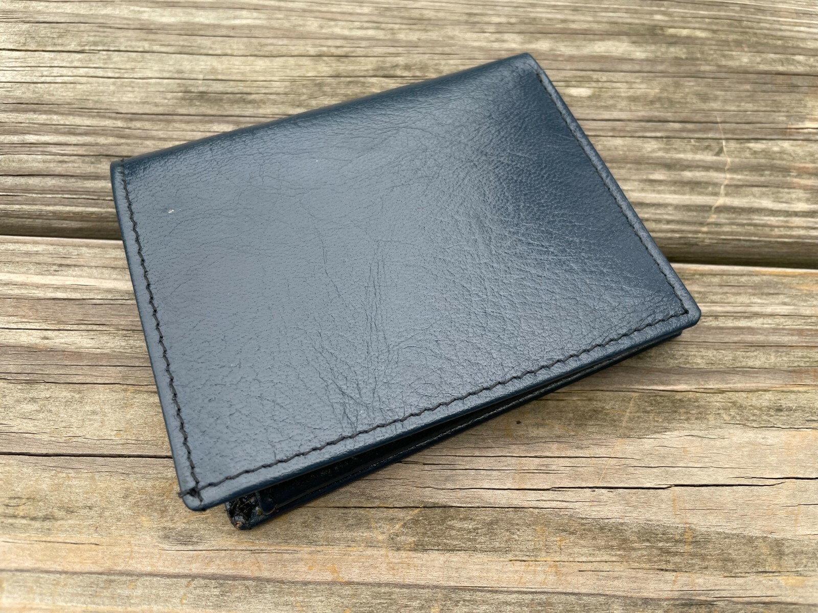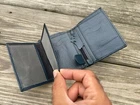 Men Card Holder Blue handmade Genuine Leather Wallet Purse New Color = Blue Unique feature - Colors and Style Size: 4X4.75 inches (Closed), 8X4.75 inches (opened) Hand Made Genuine Leather Inside: 11 slots for credit/bank cards 2 separated slots for bills 3 Hidden pocket behind the credit/bank card slot 3 Slots for Photo ID 1 coin pocket with zip Made in Pakistan Brand New. Never used.