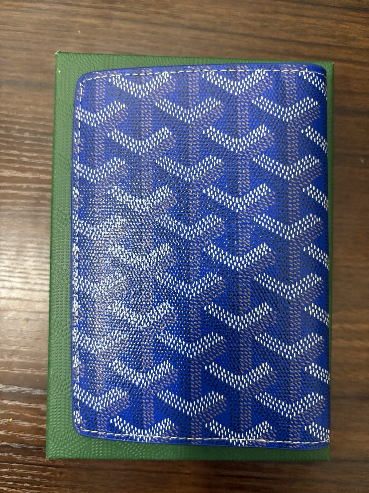 The Blue Goyard Grenelle Passport Holder is a stylish and luxurious accessory designed for both men and women. Made of high-quality leather by the prestigious brand Goyard, this bifold wallet features a sleek design perfect for keeping your passport, cards, and other essential documents safe and organized while traveling. The beautiful blue color adds a touch of sophistication to any outfit, making it a must-have for those on the go.