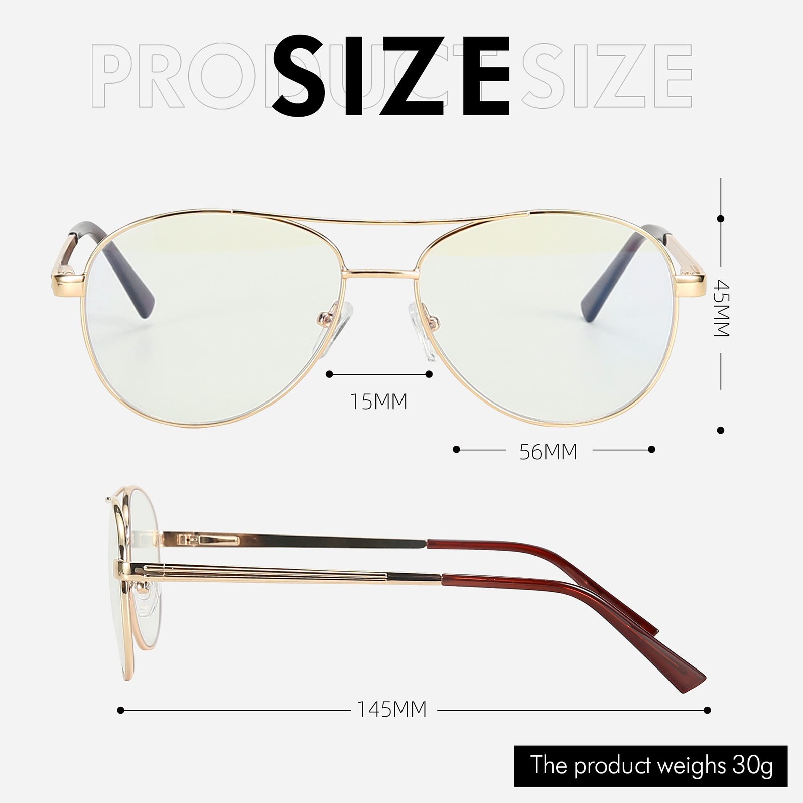 ABOUT THIS PRODUCT: Blue light blocking Reader also can block the harmful blue light, help you reduce eye strain and headache. We promise to provide you with quality after-sales service. If you have any issues, please contact us on priority, We promise to exchange or refund. REDUCE EYE FATIGUE - Blue light from computer screen, smartphone, TV, etc in our digital lives. blue light blocking glasses block over 90% of harmful blue rays, reduce eye strain, anti eye fatigue. CLASSIC STYLE - Classic aviator frame shape, 3 stylish colors to maintain your stylish look and style while protecting your eyesight. HIGH-QUALITY MATERIALS - Lightweight and durable. These aviator style blue light blocking glasses are made of ultra-thin metal materials, soft silicone nose pads, durable metal hinge, all the details ensure perfect performance. COMPLETE ACCESSORIES- The package includes aviator glasses, glasses bags, and exquisite carton packaging. NO-RISK PURCHASE -- If you have any issues with the product, please feel free to contact us. We will reply within 24 hours and find a good solution.
