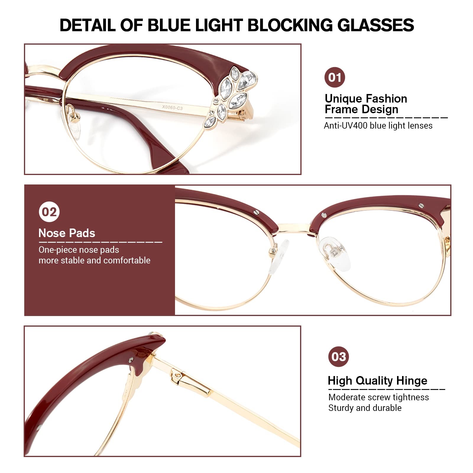 Product instruction: (1) Why do we need to filter blue light? ▶ Blue light from our computers, phones, tablets and other electronic products causes our eyes to not only work harder but puts them at risk of aging faster. ▶ By wearing blue light blocking glasses, you can limit the amount of blue light that enters your eyes and make your screentime more pleasant. Reduce eye strain, eye fatigue and sensitivity to light during computer term or any other digital time. Protect Your Eyes from macular degeneration and early vision loss, more concentrate on working and learning. ▶ glasses are specially designed to filter out harmful blue light. ▶ Reduce the symptoms of digital eyestrain Eyestrain, Headaches, sore or tired eyes, and stiff necks are all symptoms of digital eyestrain. blue light blocking glasses make screen time more comfortable and help eliminate symptoms of digital eyestrain. Product Specification: Gender: Women Rim: Full rim Materials: Mixed material Shape: Cat eye Frame Weight: 37.00 g Spring Hinge: NO 【Unique Cat Eye frame Design】Classic red browline shape frame presents an outstanding appearance, sleek metal temple perfects the whole design. 【Premium Material】These stylish blue light glasses are made of Mixed material, wear comfortable, durability. 【Protect Your Eyes】Using blue light blocking lens, reflect and filter UV, blue light, protect your eyes and reduce eye fatigue, dry and headache during use computer or phone, enjoy a better sleep. 【Interchangeable Lenses】It can also be exchanged for your myopia or other lenses at any optical store. 【The Perfect Gift】These stylish blue light glasses are a wonderful, thoughtful and practical gift for friends and family!