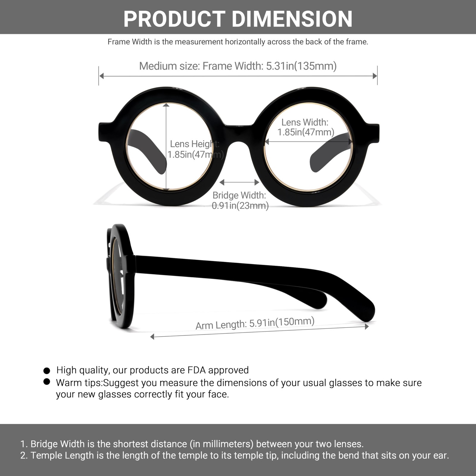 Product Specification: Gender: Women, Men Rim: Full Rim Materials: Acetate Shape: Round Frame Weight: 36.5g RX Range: -20.00~+12.00 PD Range: 2.13 " ~3.07"/(54~78 mm) Product instruction: (1) Why do we need to filter blue light? ▶ Blue light from our computers, phones, tablets, and other electronic products causes our eyes to not only work harder but puts them at risk of aging faster. ▶ By wearing blue light blocking glasses, you can limit the amount of blue light that enters your eyes and make your screen time more pleasant. Reduce eye strain, eye fatigue, and sensitivity to light during computer terms or any other digital time. Protect Your Eyes from macular degeneration and early vision loss, more concentrate on working and learning. ▶ glasses are specially designed to filter out harmful blue light. ▶ Reduce the symptoms of digital eyestrain Eyestrain, Headaches, sore or tired eyes, and stiff necks are all symptoms of digital eyestrain. Voogueme blue light blocking glasses make screen time more comfortable and help eliminate symptoms of digital eyestrain. ❤ These retro round frame glasses are made of acetate, beautiful and durable, and comfortable to wear ❤Unique round frame and color design, these eyeglasses are just excellent in every way, making you stand out, different and stylish ❤ With the amount of chic everyday collocation just right, unique yet personality, suit for any occasion ❤ Using blue light blocking lenses, block blue light and UV light, protect your eyes, and reduce eyestrain during the use computer, cell phone, or other electronic product ❤ Dimension -- Lens Width:1.85" (47mm), Lens Height: 1.85" (47mm), Bridge Width:0.91" (23mm), Frame Width:5.31" (135mm), Arm Length:5.91" (150mm)