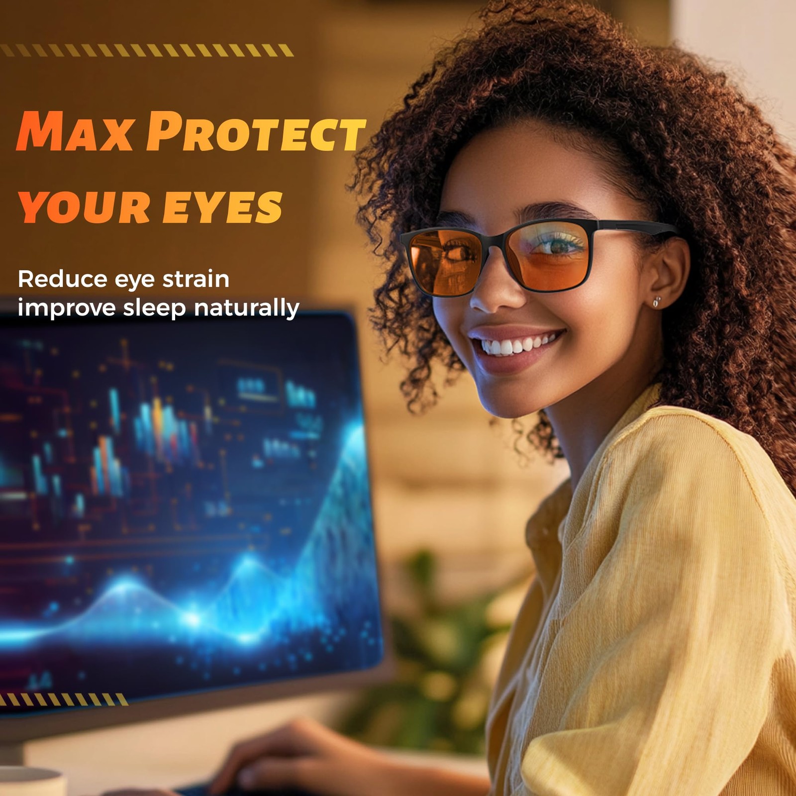 Experience unparalleled comfort and style with the Gaming Blue Light Blocking Glasses. Designed with black plastic frames, these glasses not only look fantastic but are also incredibly durable, promising to be your trusty companion for many years to come. Crafted to perfection, they fit seamlessly, providing a comfortable wear for extended periods. The Gaming Blue Light Blocking Glasses offer more than just good looks. They effectively protect your eyes from harmful blue light, making it easier to see clearly even when the sun is glaring. As an added bonus, these glasses contribute to a better night's sleep by reducing the blue light exposure from screens, helping you unwind and relax before bed. Whether you’re gaming, working, or browsing on your phone, these glasses are your perfect partner in maintaining eye health and improving sleep quality. Highly recommended for everyone, the Gaming Blue Light Blocking Glasses are a must-have for anyone looking to enhance their visual comfort and overall well-being. Block 98% Blue Light – computer gaming glasses filter harmful blue light to protect eyes from digital strain and potential long-term damage. Reduce Eye Strain & Headaches – Amber lenses help alleviate fatigue, dryness, and discomfort from prolonged screen time. Improve Sleep Naturally – By blocking more blue light than standard glasses, these lenses support better sleep after nighttime gaming or computer use. Lightweight & Stylish Design – Classic black frame with a modern fit, suitable for both men and women. Lifetime Warranty – Backed by ’s 100% satisfaction guarantee and friendly US customer support, feel free to contact us.