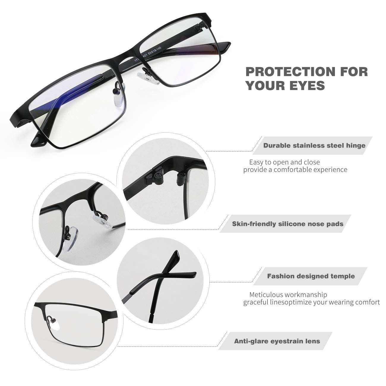 Blue Light Blocking Glasses,Mens Blue Light Glasses,Metal Frame for Men Teen Boys, Computer Filter Anti UV Protection Black Eyeglasses FILTER HARMFUL BLUE LIGHT,blue light blocking glasses can filter out nearly all harmful blue light when you are front of your laptop,gaming computer,mobile phone and other electronic equipment,suitable for man REDUCE EYESTRAIN AND HEADCHE,blue light glasses protect your eyes from direct UV rays,it makes you safer when driving and more comfortable when playing computer games and playing mobile phones. HIGH QUALITY MATERIAL,the metal frame made from high quality material,which is lightweight and durable,you won’t feel tired when you wear the blue light glasses for a long time. COLORLESS LENS,no color difference in your eyes when you are working or staring screens,it is a good working or life company. GOOD GIFT CHOICE,everyone need a pair of blue light glasses to protect your eyes from anywhere devices,it is a good gift for Girlfriend, Boyfriend,Weddings, Anniversary, Birthdays, Graduations, Valentine’s Day,Mother’s Day,Father’s Day,Thanksgiving Day,Christmas Day.