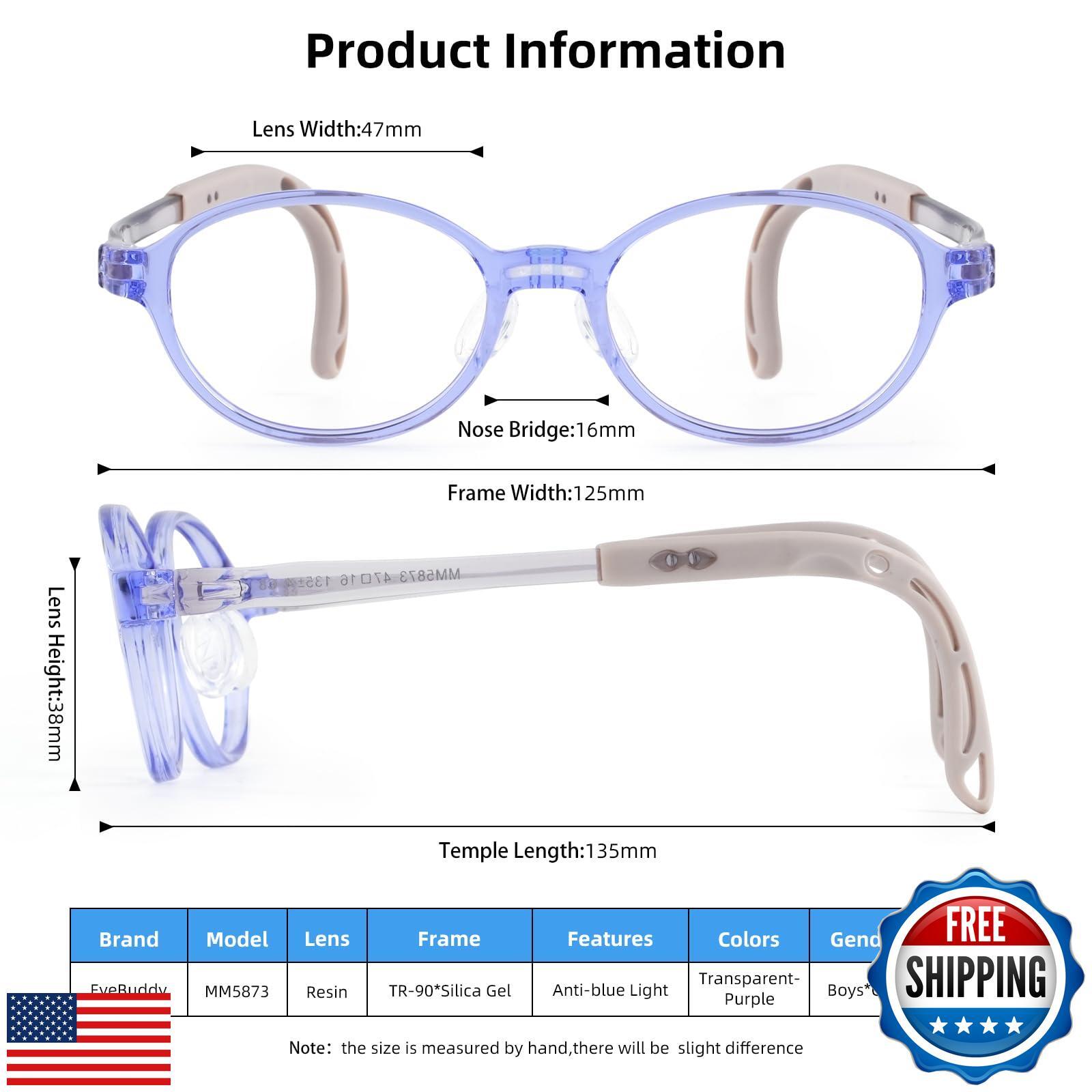 EYEBUDDY Blue Light Glasses for Kids,Blue Light Blocking Glasses for Boys Girls Ages 3-13, 2 Packs Bluelight Glasses Computer, Gaming, Reading Features Blue Light Protection: These kids blue light glasses are specially designed to block harmful blue light emitted from digital screens, alleviate eye strain and improve visual comfort. Durable Construction: The blue light glasses for kids are made from high-quality, durable materials. The flexible and impact-resistant glasses frame can withstand the wear and tear of daily activities, extending the lifespan of the glasses. Comfortable Fit: The blue light blocking glasses feature a lightweight, ergonomic frame design that conforms to the child's facial contours, ensuring a comfortable fit. With high transparency to restore true colors, they are suitable for extended wear. Stylish Designs: With a variety of fun and stylish colors and styles, these fashion glasses cater to different preferences, encouraging children to wear their eye glasses more often to protect their eyes. Size/Package: EYEBUDDY blue light filter glasses come in various sizes, suitable for boys and girls aged 3-12 (3-6,5-8、7-13、13+). They are packaged in a beautiful gift box, making them an ideal practical gift for children. Shipping Free & Fast Shipping: We offer free shipping to most of the USA with a normal delivery time of 3-7 days. However, due to the current situation, additional delivery time (up to 3 weeks) may be required for some items. Alternative Carriers: We may use alternative carriers (e.g., USPS, FedEx, UPS) to ensure your package arrives safely and on time. Due to the use of multiple carriers, we are unable to provide a tracking number automatically. Handling Time: Orders are processed and shipped within 1-2 business days of receiving cleared payment. Shipping Restrictions: Shipping to Alaska, Hawaii, Puerto Rico, Guam, and other US territories may incur shipping charges or delivery restrictions. Please contact us before ordering, or your order can be refunded/cancelled. State Restrictions: Certain items may not be shipped to California due to state regulations. Contact for Tracking Updates: If you require tracking updates or have any concerns about the delivery of your order, please feel free to contact us, and we will be happy to assist you. Return Policy 30-Day Hassle-Free Returns: If you are not completely satisfied with your purchase, you can return the item for free within 30 days of receiving it for a full refund or exchange. Easy Return Process: Contact us, and we will provide you with a prepaid return shipping label and detailed instructions. No Restocking Fee: There are no restocking fees for returns. However, the buyer is responsible for return shipping costs if the return is not due to a seller's error. Refund Processing: Refunds will be processed within 1 business day of receiving the returned item in its original condition. Payment We accept all major credit cards, PayPal, and Apple Pay for your convenience. Your payment information is secure and encrypted to ensure a safe and seamless transaction. Please complete your payment within 3 days of purchase to avoid any delays in shipping. Feedback Your feedback is extremely important to us. We strive to provide the best products and customer service possible. If you are satisfied with your purchase, please take a moment to leave us a positive review. If you have any concerns or issues with your order, please contact us before leaving negative feedback. We are committed to resolving any problems and ensuring your satisfaction. Contact Us If you have any questions or concerns, please feel free to reach out to our customer support team. You can contact us through the eBay messaging system. We are available Monday to Friday, 9:00 am to 5:00 pm EST, and we will do our best to respond to your inquiry within 24 hours. Thank you for supporting our small family business!