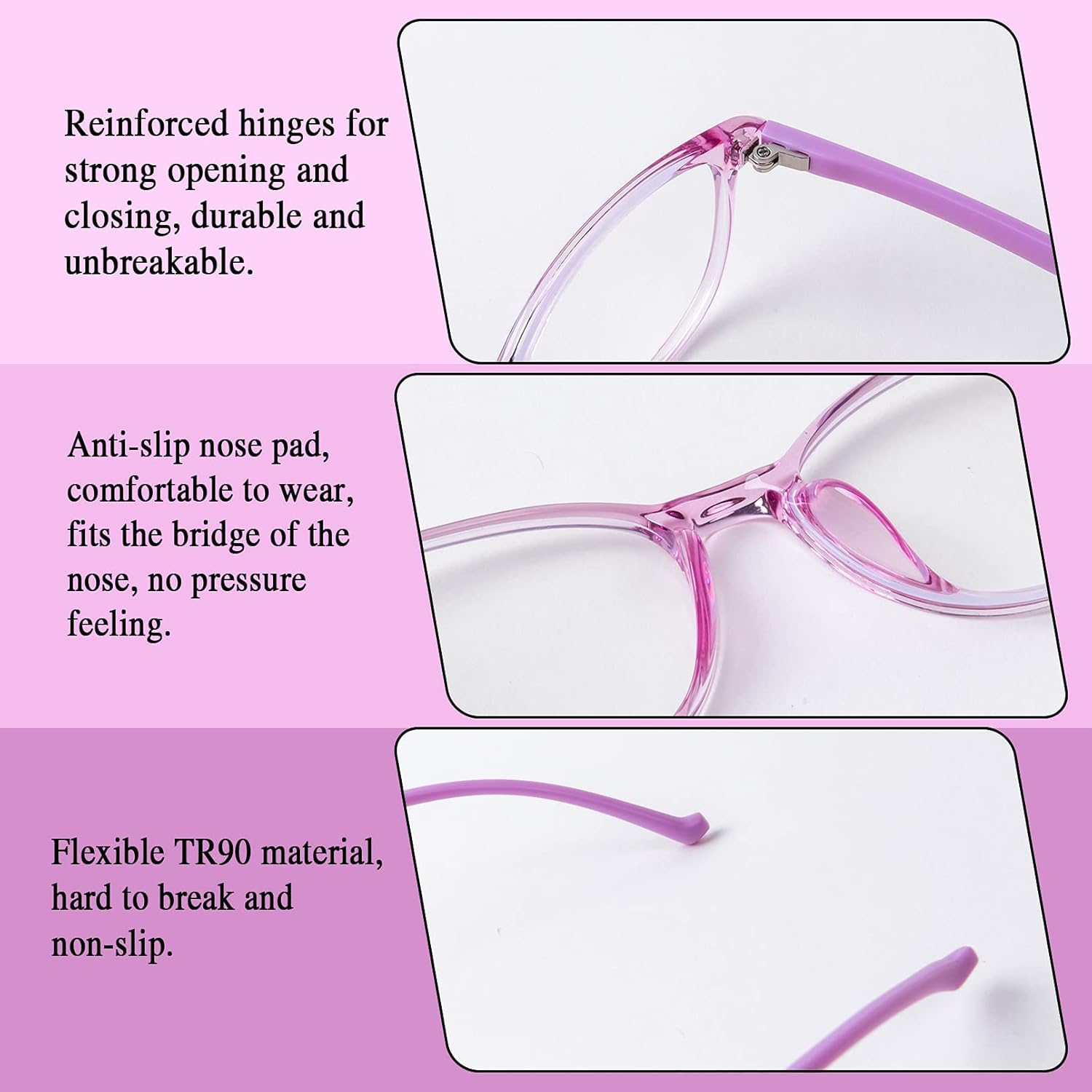 Menu Other Items Feedbacks About Us Contact Us Add To Favorites Ultra-Light Blue Light Blocking Glasses with Case for Kids and Teens,Anti Eyestrain &UV400 At present, need to use electronic products whether school education or entertainment games. Because digital screen can emit bright blue light that still penetrates your kids eye to the retina that cause kids's eye strain and blurred vision even dizziness, so it is important for protecting kids' eyes. The blue light glasses are made of high-quality TR90 frame material for durability and comfort to wear for a long time. Eyeglasses temples have built-in memory metal, not be deformed by any bending, very flexible and not easy to break, not easy to fall off. The kids teens eyeglass features a variety of bright colors and square eyewear frames, this fashional style can show off the unique sense of style kids like, offer healthy and fashionable glasses products for children. Color: Clear Pink Specifications: Frame Width 4.56 inch/116mm Lens Width 1.96 inch/50mm Frame Height 1.37 inch/35mm Bridge Width 0.62 inch/16mm Frame Arm Length 5.43 inch/138mm Suitable for both boys and girls age 5-13 Package Include: 1* Kids Blue Light Blocking Glasses 1* Cleaning Soft Cloth 1* Adjustable Eyeglass Strap 1* Mini Screwdriver 1* Glasses Box 1* Glasses Packaging Box TIPS: Cleaning cloth, eyeglass strap and glasses box are all random patterns or colors. Item Specification Department Unisex Kids Color Clear Purple SHIPPING FREE FAST SHIPPING FREE SHIPPING We are always working hard to ensure your package arrives as soon as possible. Please understand that some factors like weather, high postal traffic, and the performance of shipping companies are outside of our control. We offer free shipping to the lower 48 states. We do not accept P.O. Boxes. Please provide a physical address. If you have a problem or question regarding your transaction please contact us immediately. We will work with you to resolve any problem you may have. Thank you