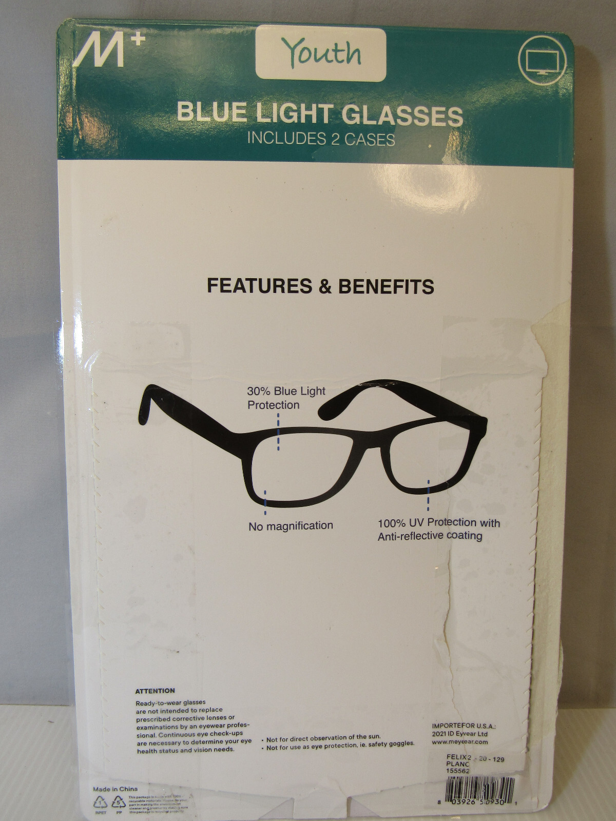 M+ Boy's Youth Blue Light Glasses with Pouch, 2-pack, No Magnification Open Box... PRODUCT DETAILS: Easy to Wear Retro Inspired Round glasses with blue light blocking lenses to help protect kids’ eyes and spring hinges for ultimate comfort, durability, and functionality. Plastic is light weight for perfect fit... Package was half opened, items were not removed..Package was re sealed... I fully guaranty the quality and integrity of the item...