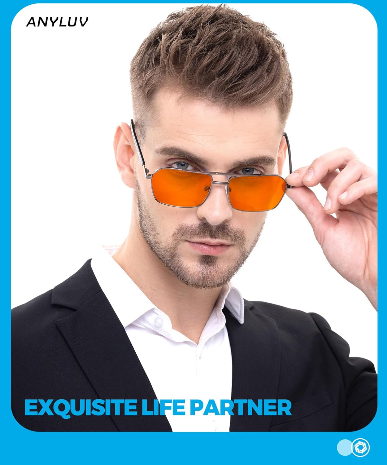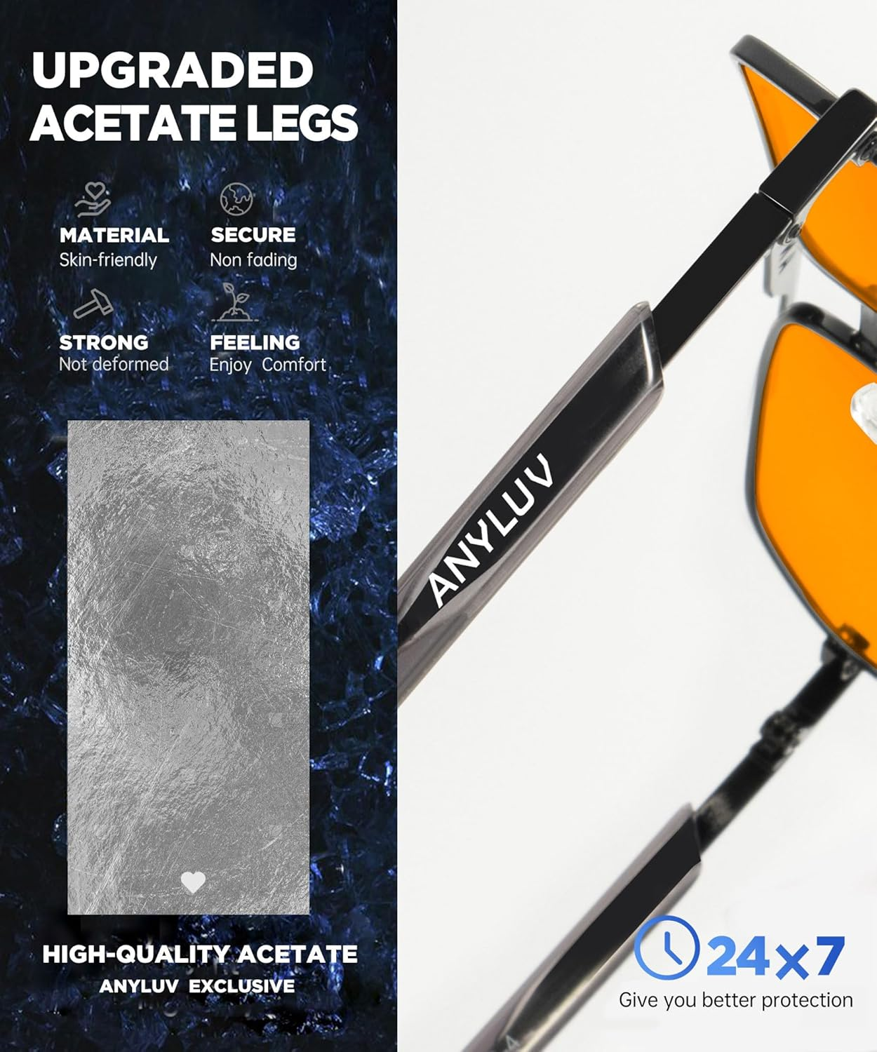 💻Blue Light Blocking Rate: 99%⏩ These blue light gaming glasses can filter 99% of harmful blue light from computers and other devices, help release eye fatigue. When you playing game on electronic screens for long time, these ANYLUV blue light gaming glasses for men can help make eyes relaxed, meantime improve sleep quality 💻Amber Blue Light Blocking Glasses⏩ This type of blue light glasses lens can effectively blocks almost all blue light, alleviating eye fatigue. providling outstanding blue light protection. Recommended for wearing during electronic gaming time, and contributes to better sleep. 💻Trendy Blue Light Glasses⏩ Designed with square slim frame and ANYLUV logo decor temple, very exquisite and fashion style. These anti blue light glasses help show a sophisticated look that complement any outfits, whether you're working or casual daily life 💻Upgraded Metal Material⏩ Lightweight metal frame and temple make the blue light glasses men more durable and high quality. Soft rubber nose pad comfortably fit your nose and isn't slipping easily 📖After-Sales Brand Service⏩ ANYLUV attach great importance to product quality and customer satisfaction. Each customer can enjoy after-sale brand service for our reading glasses. Please feel free to contact our customer service if you have any product problem. Product Description The video showcases the product in use. The video guides you through product setup. The video compares multiple products. The video shows the product being unpacked. hero-video Merchant Video 1 WEAR-RESISTANT FRAME 2 METAL HINGE 3 PREMIUM MATERIAL 4 PREMIUM BLUE LIGHT LENS 5 PACKAGE INFO ANYLUV Blue Light Glasses Contrast Add to Cart Add to Cart Add to Cart Add to Cart Customer Reviews — 4.5 out of 5 stars 222 4.4 out of 5 stars 84 4.4 out of 5 stars 899 — Price — $29.99 $ 29 . 99 $23.99 $ 23 . 99 $21.99 $ 21 . 99 $50.00 $ 50 . 00 Color Low color distortion Low color distortion Low color distortion Amber tinted lens Amber tinted lens Anti-Blue Performance Significant reduce blue light Significant reduce blue light Significant reduce blue light Blocks almost all blue light Blocks almost all blue light Applicable Scenario For all-day use For all-day use For all-day use For extensive screen users For extensive screen users Lens Width 2.20 inches 2.28 inches 2.28 inches 2.16 inches 2.05 inches Lens Height 1.50 inches 1.57 inches 1.54 inches 1.34 inches 1.69 inches