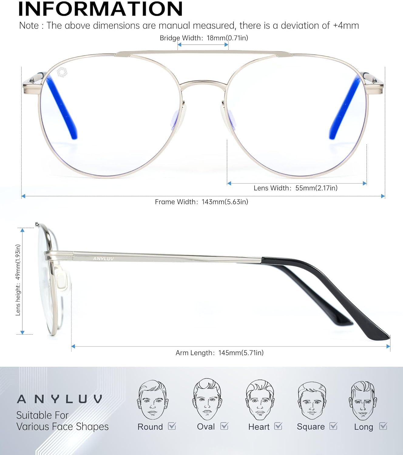 Product Description 1 UNIQUE FRAME DESIGN 2 EXCELLENT ANTI-BLUE LENS 3 EXQUISITE TEMPLES 4 ANYLUV METAL 5 LUXURY ACCESSORIES ANYLUV Blue Light Glasses Contrast Add to Cart Add to Cart Add to Cart Add to Cart Add to Cart Customer Reviews 4.4 out of 5 stars 1,149 4.4 out of 5 stars 221 4.4 out of 5 stars 81 4.5 out of 5 stars 857 — 5.0 out of 5 stars 2 Price $21.91 $ 21 . 91 $29.99 $ 29 . 99 $23.99 $ 23 . 99 $17.59 $ 17 . 59 $50.00 $ 50 . 00 — Color Low color distortion Low color distortion Low color distortion Amber tinted lens Amber tinted lens Orange tinted lens Anti-Blue Performance Significant reduce blue light Significant reduce blue light Significant reduce blue light Blocks almost all blue light Blocks almost all blue light Blocks all blue light Applicable Scenario For all-day use For all-day use For all-day use For extensive screen users For extensive screen users Contributes to better sleep Lens Width 2.28 inches 2.28 inches 2.28 inches 2.16 inches 2.05 inches 2.13 inches Lens Height 1.77 inches 1.57 inches 1.54 inches 1.34 inches 1.69 inches 1.46 inches