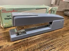 This Retro Swingline Stapler is a must-have for any office. With its heavy-duty construction and long reach, it can handle up to 30 sheets of paper at once. The slate blue color adds a pop of retro style to your desk. Made in China, this standard stapler is perfect for all your stapling needs. It comes with a box and is ready to use right out of the box. The brand name Swingline is synonymous with quality and this stapler does not disappoint. Get yours today and make your office look more efficient. DOES NOT INCLUDE STAPLES!