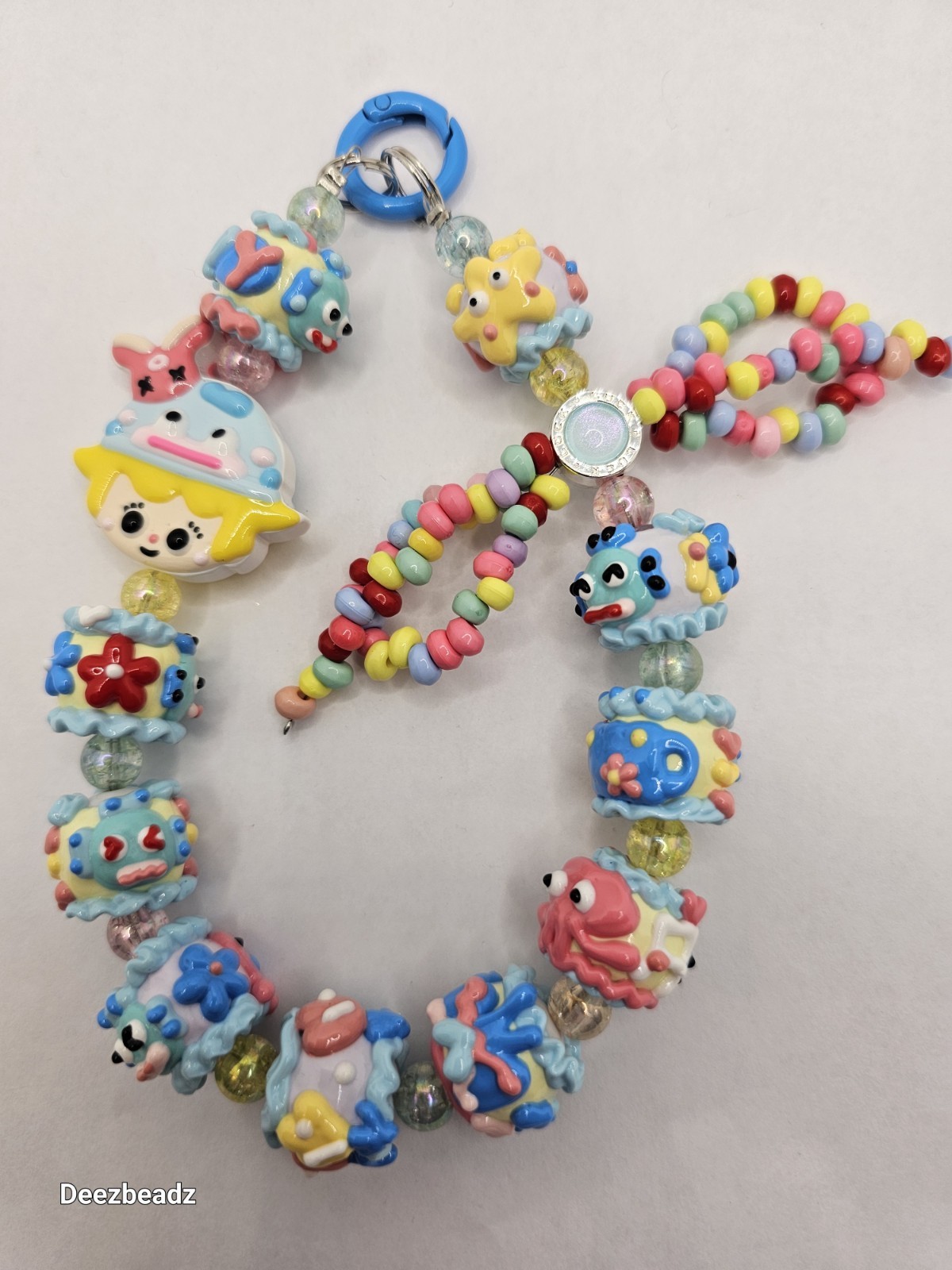 This bagcharm features handprints beads and charms and is inspired by sanrio characters. This was made by hand.