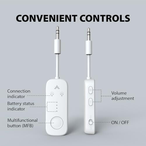 Experience audio freedom like never before with this versatile Bluetooth Relay, designed to elevate your listening experience across a multitude of devices. Whether you're on a long-haul flight, enjoying a movie on your TV, or getting pumped up at the gym, this Relay seamlessly connects to any device with an AUX output. The included dual 3.5mm adapter ensures compatibility with all types of connectors, making it your perfect travel companion.Equipped with aptX-Adaptive and aptX-Low Latency codec support, the Relay guarantees high-fidelity sound with minimal delay, allowing you to immerse yourself in your favorite tunes or shows without missing a beat. Thanks to the advanced Bluetooth 5.3 technology, you can expect stable and reliable connections, ensuring your audio experience is uninterrupted.Sharing is caring! The Relay's intuitive LED indicators make it easy to connect up to two devices simultaneously, so you and a friend can enjoy the same audio experience while on the go. With an impressive battery life of up to 20 hours, you can travel worry-free. And if you do run low on power, simply plug it in and keep the music flowing while it charges.Control your audio experience effortlessly with built-in features that allow you to adjust volume, pair devices, and monitor battery levels at a glance. With over two decades of expertise in Bluetooth technology, this Relay combines trusted innovation with premium Qualcomm chipsets, ensuring superior audio quality and stronger connections. Elevate your audio experience today and enjoy the freedom of wireless listening wherever you go! AUX & Bluetooth Wide device use 1. Wide Compatibility 2. APTX Support 3. Listen Together 4. Long Battery Life 5. Easy Controls 6. Trusted Quality AUX Bluetooth Hub 1. **AUX Versatility** 2. **Low Latency** 3. **Dual Connect** 4. **20Hr Battery** 5. **Easy Control** 6. **LED Indicators** 7. **Stable Link** 8. **Trusted Tech**
