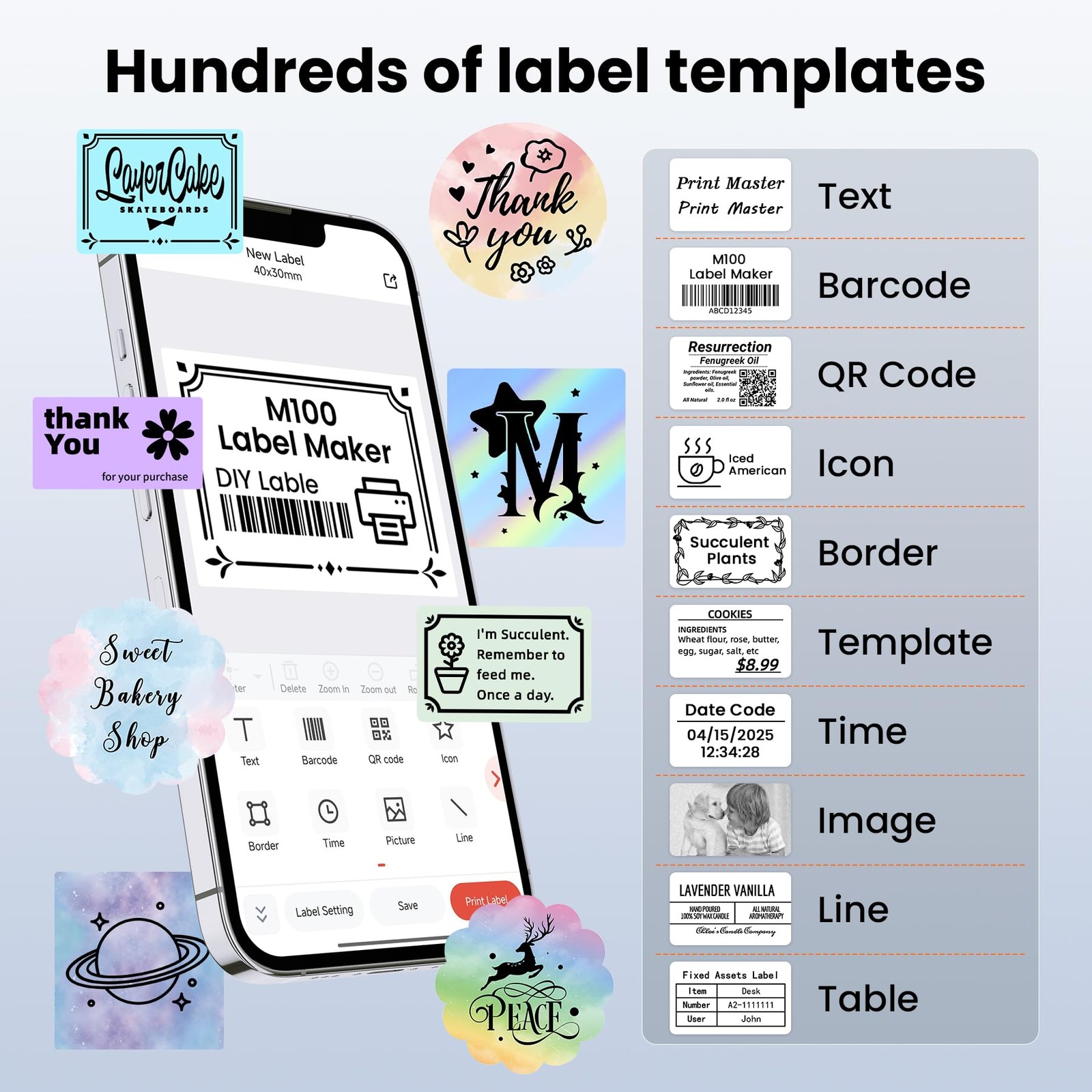 The bluethooth portable thhermal label printer compatible with Phone & PC. You can use it to easily print any labels you need, price labels, jewelry labels, address labels, folder labels and more. The label maker machine with tape is perfect for small business. Widely Use for Small Business and Home: This label maker machine with tape is perfect for any project for your small business. You can easily print price tags, clothing labels, address labels, barcodes, product labels and more. It can also meets various holiday label needs. Easy to Use: The bluetooth label maker supports iOS & Android and PC. For mobile phones, you can download the "Print Master" app and connect Bluetooth to print. For PC, you can download the compatible program "Labelife" and connect to print via USB. Print any label you need easily in just seconds Ink-Free & Cost-Effective Printing: Leveraging direct thermal technology, our label makers deliver HD-quality prints without the need for ink or toner. Plus, you can opt for cost-effective thermal paper of suitable sizes, eliminating the need for expensive proprietary label paper. With a printable label width ranging from 20mm to 48mm (out of a 50mm paper width). Powerful APP: Our "Print Master" APP supports more than 20 fonts and languages, 70 borders and 1200 symbols. You can also set up and save your own templates. And our barcode label printer supports various functions such as QR code, barcode, table, material, time, number, text, icon. You can also print in batches, greatly improving your work efficiency Thermal Label Maker: This adress label maker is only half the size of your mobile phone. You can bring this portable bluetooth label printer to anywhere. Mini and compact design, it doesn't take up any space even if you put it at home. And it is very convenient to operate with one hand, suitable for family members of any age