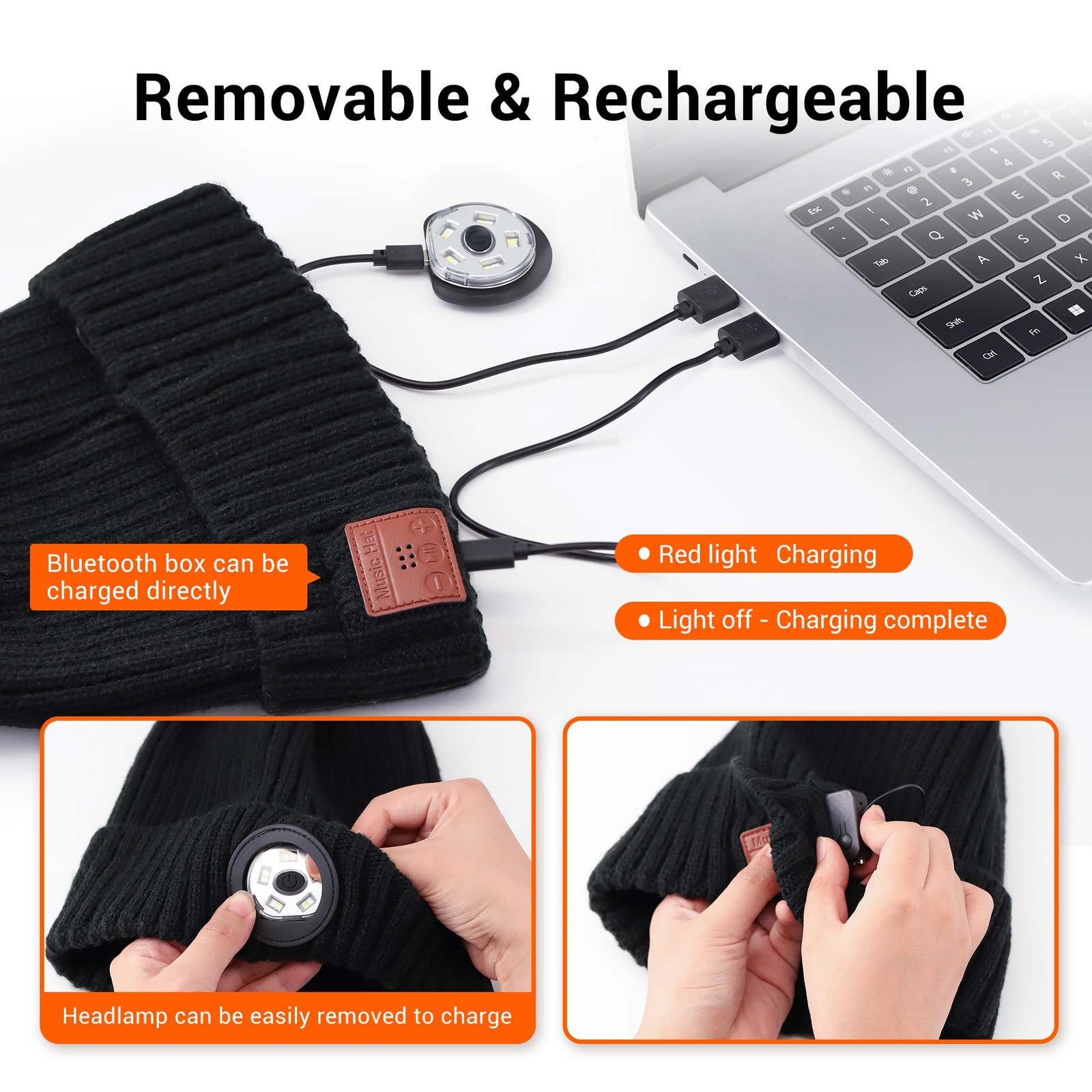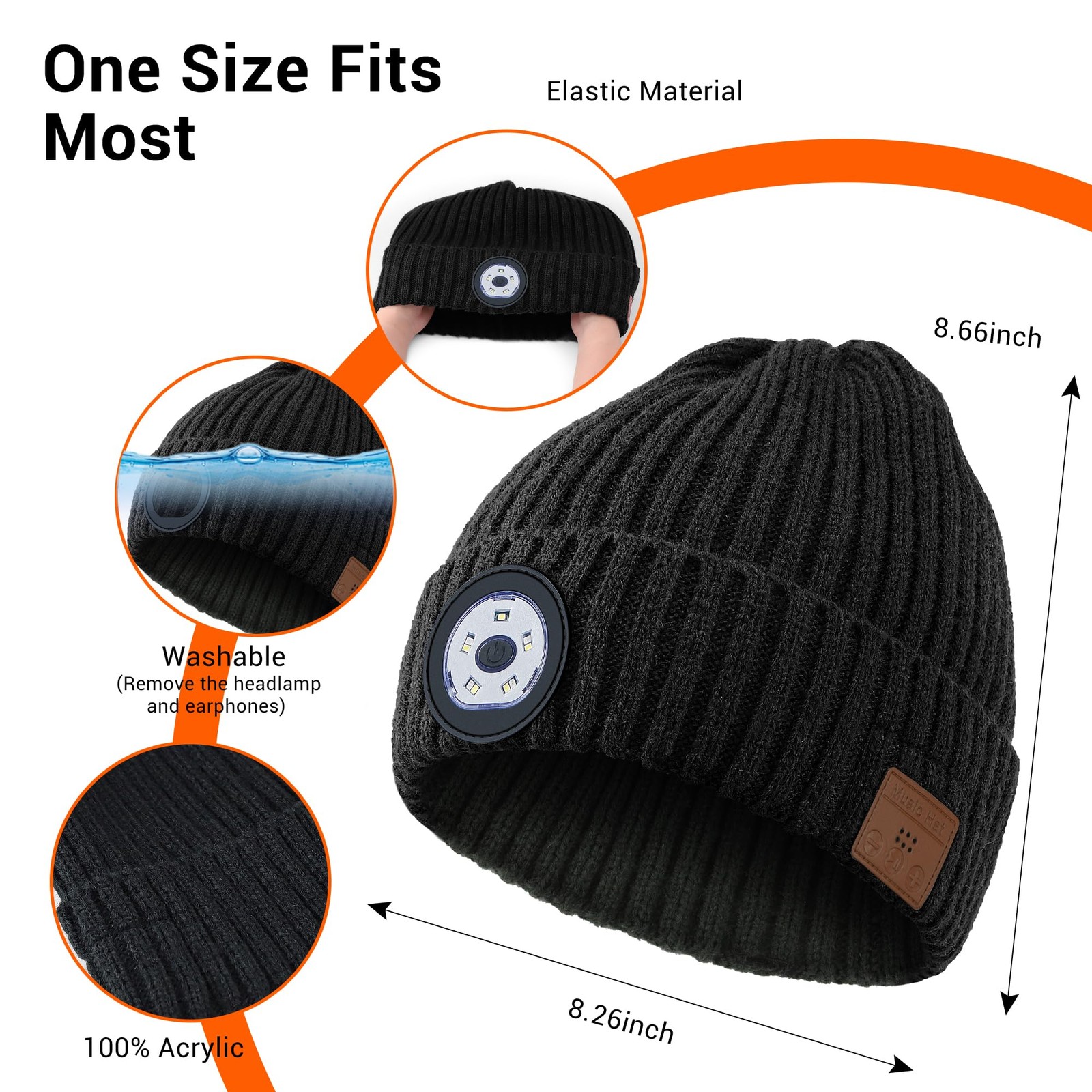 Bluetooth Beanie with Light,Music Hat with Headphones and Built in Speaker Mic,USB Rechargeable LED Headlamp Beanie,Unisex Outdoor Sport Knit Hat Black High Quality:This Bluetooth beanie hat with light is crafted from ultra-soft and excellent insulating acrylic stretchable materials, ensuring optimal comfort for various indoor and outdoor activities. Led beanie hat with light adopts the upgraded bluetooth function,built-in stereo speakers and microphones bring you panoramic sound effects and enhance your music listening experience. One Size Fits All: The stretchy design of this headlamp beanie ensures a snug and comfortable fit for most head sizes, making it suitable for men and women alike. Whether you're hiking, camping, or working outdoors, this beanie is the ideal companion. Perfect Gifts:The LED bluetooth beanies are awesome stocking cap stuffers, great gifts for men, dad, husband, women, mom, boyfriends, girlfriends, him or her, also the prefer gift choice for Christmas, Thanksgiving Days, Family Parties and Friends. Wide Range of Applications :This black beanie features built-in Bluetooth headphones and a rechargeable LED light. Whether jogging, fishing, or walking the dog at night, enjoy the convenience of hands-free illumination and entertainment with this bluetooth beanie. Excellent Battery Performance:Our beanie hat light with three adjustable brightness levels, you can easily customize the lighting to suit your preferences. The lowest brightness level can last up to 8 hours, the middle level up to 4 hours, and the highest level up to 2 hours. The beanie features four built-in LED lights that can illuminate objects up to a distance of 30 feet. This directional lighting ensures efficient battery usage by illuminating what your eyes are focused on.