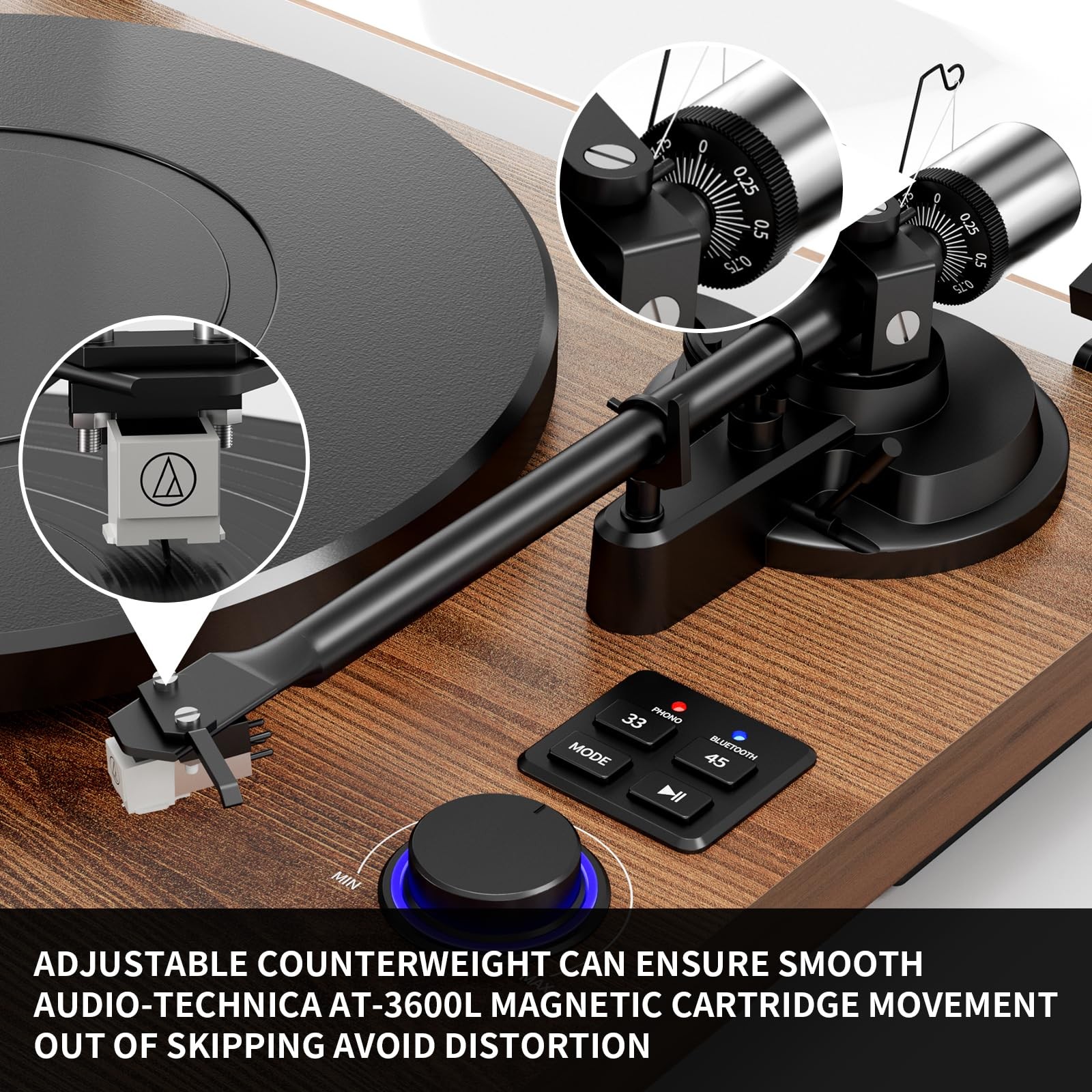 Bluetooth Turntable HiFi System – Premium Vinyl Experience If you're searching for a high-quality vinyl record player that blends vintage charm with modern technology, the Bluetooth Turntable HiFi System is a top contender. This belt-driven turntable delivers crisp, immersive sound through its 36-watt bookshelf speakers, making it perfect for audiophiles and casual listeners alike.The Bluetooth Turntable HiFi System is a high-quality vinyl record player designed for audiophiles and modern music lovers. Combining vintage charm with modern technology, this turntable delivers rich, immersive sound through its 36-watt bookshelf speakers while offering versatile playback options. Key Features: ✅ Patented Magnetic Cartridge – Ensures precise tracking and minimal record wear for superior sound clarity. ✅ Hi-Fi Sound with 36W Bookshelf Speakers – Powerful stereo speakers deliver deep bass and crisp highs for an authentic vinyl experience. ✅ Bluetooth 5.0 Playback – Stream music wirelessly from smartphones, tablets, or other Bluetooth-enabled devices.Perfect Balance of Analog & Digital – Enjoy vinyl records or stream music via Bluetooth seamlessly. ✅ Auto-Stop Function – Protects your records by automatically stopping playback when the record ends. ✅ 3-Speed Belt-Drive System (33/45/78 RPM) – Plays all standard vinyl formats (LPs, singles, and vintage 78s). ✅ Sleek & Stable Design – Anti-resonance wooden chassis reduces vibrations for clearer sound.Elegant Aesthetic – The wooden finish and compact bookshelf speaker design fit well in any home decor. ✅ Multiple Connectivity Options – Includes RCA line-out, AUX input, and headphone jack for flexible use.User-Friendly Design – Easy setup, automatic stop, and belt-driven mechanism make it ideal for beginners and experts alike. This turntable is highly welcome by customers for its excellent sound quality, durability, and versatility. It’s a favorite among vinyl enthusiasts who want a budget-friendly yet high-performance system that supports both traditional and wireless playback. Many users praise its easy setup, stylish look, and distortion-free sound, making it a top choice in its price range.If you want a versatile, high-quality record player that supports both vinyl and digital music, Our Bluetooth Turntable HiFi System is an excellent pick. With its powerful speakers, Bluetooth compatibility, and auto-stop function, it’s a fantastic entry-level to mid-range turntable that won’t disappoint. [Premium Sound Quality with Moving Magnet Cartridge] The included high-quality AT Moving Magnet-type cartridge and stylus produces rich, warm audio and outstanding sound clarity. [Bluetooth Connection] - Stream music wirelessly from smartphones, tablets, or other Bluetooth-enabled devices.Perfect Balance of Analog & Digital. Note: This turntable supports Bluetooth input only (for receiving audio from devices). It cannot connect to Bluetooth speakers as an output. [Adjustable Counterweight & Solid Iron Platter] - Adjustable counterweight ensures smooth movement of the Audio-Technica pen to maintain clarity about musical tips and avoid distortion. The precision-machined solid iron turntable produces an even inertia mass for perfect stability and rotation. Takes high-fidelity playback to the next level. [Vinyl to MP3 Recording] - Convert turntable to a Mac or PC to MP3s via a USB connection, and take vinyl records directly into a digital USB format. Secure old vinyl to your PC or laptop. [Turntable with 36W HiFi Speaker] - Built-in switchable phono line and pre-amplifier allow to connect with the set of included speakers or your own externally-powered speakers via the dual RCA output cables. RCA output Only Can Connect to Active Speakers.The grounding cable also allows you to connect the grounding cable in your home to the grounding cable of this product, which can effectively reduce sound interference.