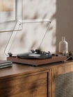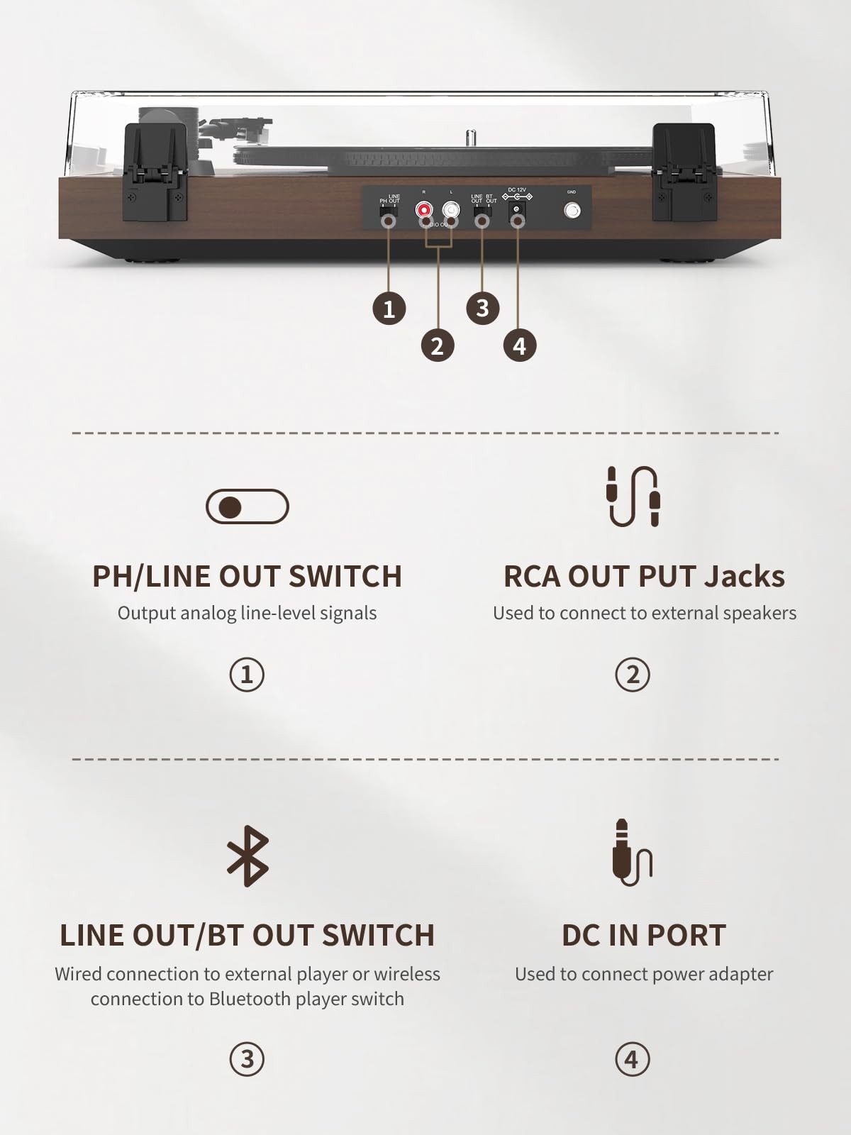 Record Player Belt-Drive Turntable with Bluetooth Output Connectivity Bluetooth Output Connectivity: Easily pair with Bluetooth speakers, Bluetooth headphones or other BT audio device for an amazing, wireless experience. Built-in Bluetooth 5.3 Connect Technology. Some Bluetooth speakers may not connect correctly because this turntable is compatible with Bluetooth protocols HFPV1.5, A2DPV1.2, AVRCPV1.4, HSP1.2, GAVDP1.2, IOP RCA Output Line Connectivity: Use RCA cables to connect your powered speakers to get more amazing sound experience. The package includes a 2 to 2 RCA audio line (1M) High Quality Magnetic Cartridge Stylus: The diamond tip stylus cartridge precisely tracks your record grooves for accurate high-definition audio, resulting in rich sound and higher-definition sound. Bringing you the ultimate music experience. Phono/Line Connectivity Options: Enjoy your vinyl with any amplifier using the Magnetic type Preamp in the turntable; This turntable includes both Phono and Line Outputs that allow playing of vinyl with or without a Phono equalizer Vintage Looking with Modern DESIGN: Turntable has a retro-era appearance design with exquisite wood grain texture, which enhances the atmosphere of the entire home. The high-quality aluminum platter and resonance-damping feet suppress unwanted vibrations for the most refined sound possible. Note: This turntable DOES NOT have built-in speakers. Enjoy your records using external wired or wireless speakers.