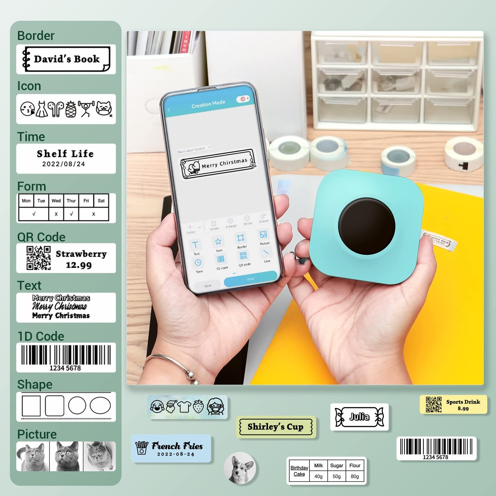 Label Maker Machine - Q30S Bluetooth Label Printer for Labeling, Handheld Thermal Sticker Maker for Smartphone, Mini Labeler with 3 Roll Labels Easy to Use for Office Home, Multiple Templates,Green ✓ Free 60 Day Returns ✓ Free Express Shipping Description: Features: Mini Label Makers-Memoqueen Q30S Portable Bluetooth Labeler, Compact Size but powerful function.is only 3.2*3.2*1.3Inch, 160g weight. Which is smaller than a palm, can easy fit into pocket or bag. Small Printer for Smartphone, Office Supplies Ideal for School, Home Storage, Office Organization Label Easier-Direct Bluetooth thermal technology-no ink, no toner, BPA-free and lower cost compared with inkjet printers. The upgraded new version of the labeling machine can for Type-C plug-in or use 4 AAA which support continuous 6 hours of working. Two modes are convenient to use in any scene. No need to charge and connect to the network, printing labels anytime, anywhere. Widely Used -The lovely sticker maker supports transparent, different color and a variety of styles of labels. Label size from 0.24 - 0.47 Inch (6-15mm). The label maker machine inclued 1 roll 14*30mm pink sticker labels , 1 roll 14*30mm transparent labels and 1 roll 14*30mm white labels already. You can easily print labels for jars, cables, name tags, expiration date reminder, drug classification and more. Great for Home, School and Office Organization. Easy To Make Label via APP-Download the [Print Master] app, and open Bluetooth to connect the label printer machine. No need any registration details. Just type the label in the APP and it will print out in the few seconds. The smart APP can save your edits and support batch printing, help job run faster. Powerful App-The application Print Master has a wide variety of templates and a large number of printing materials for free. Moreover, Q30S sticker maker supports priting patterns, text, symbols, borders, barcodes & QR codes, graphics, etc. Product Details: Brand: Memoqueen Connectivity Technology: USB Printing Technology: Thermal Special Feature: Bluetooth,Portable Color: Turquoise Model Name: Q30S Printer Output: Monochrome Item Weight: 160 Grams Product Dimensions: 3.2"D x 1.3"W x 3.2"H Controller Type: iOS Maximum Media Size: 0.47 Inch (15mm) Included Components: Labels Print media: Labels Scanner Type: Portable Max Input Sheet Capacity: 5 Compatible Devices: Smartphones Maximum Color Print Resolution: 203 dpi Sheet Size: 0.24 to 0.47 Inches Maximum Black and White Print Resolution: 203 dpi Color Depth: 24 bpp Dual-sided printing: No Maximum copies per run: 1 Max copy resolution color: 203 dpi Max copy resolution black-white: 203 dpi Duplex: Simplex Hardware Interface: Bluetooth Ink Color: Monochrome (Black) Resolution: 203 x 203 DPI Additional Printer functions: Print Only Control Method: App Number of Trays: 1 Processor Count: 1 Model Series: Q30S Printer Ink Type: Liquid Ink Memory Storage Capacity: 160 Grams Product Dimensions: 3.2 x 1.3 x 3.2 inches Item Weight: 5.6 ounces Item model number: Q30S Date First Available: March 1, 2023 Department: womens Manufacturer: Memoqueen Country of Origin: China
