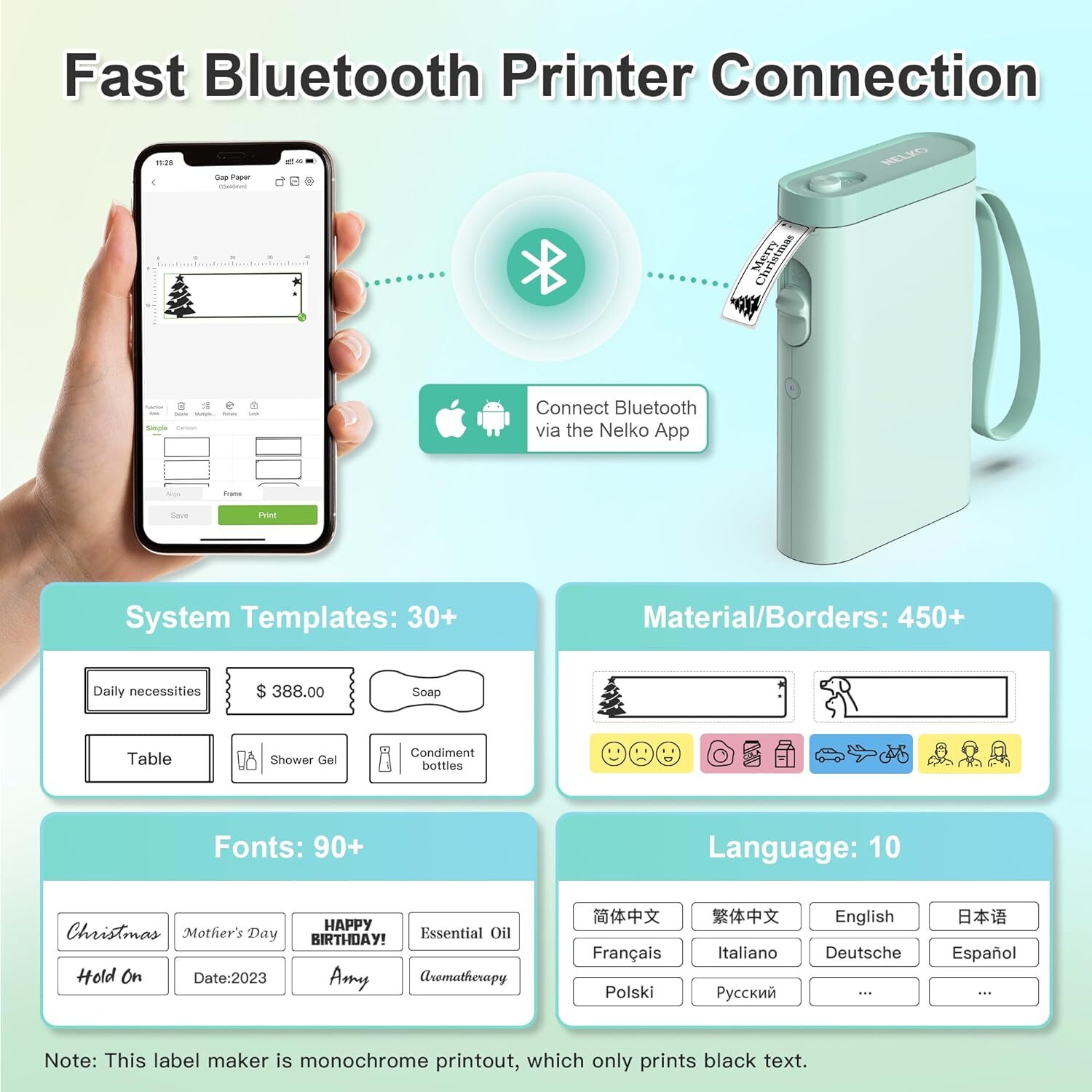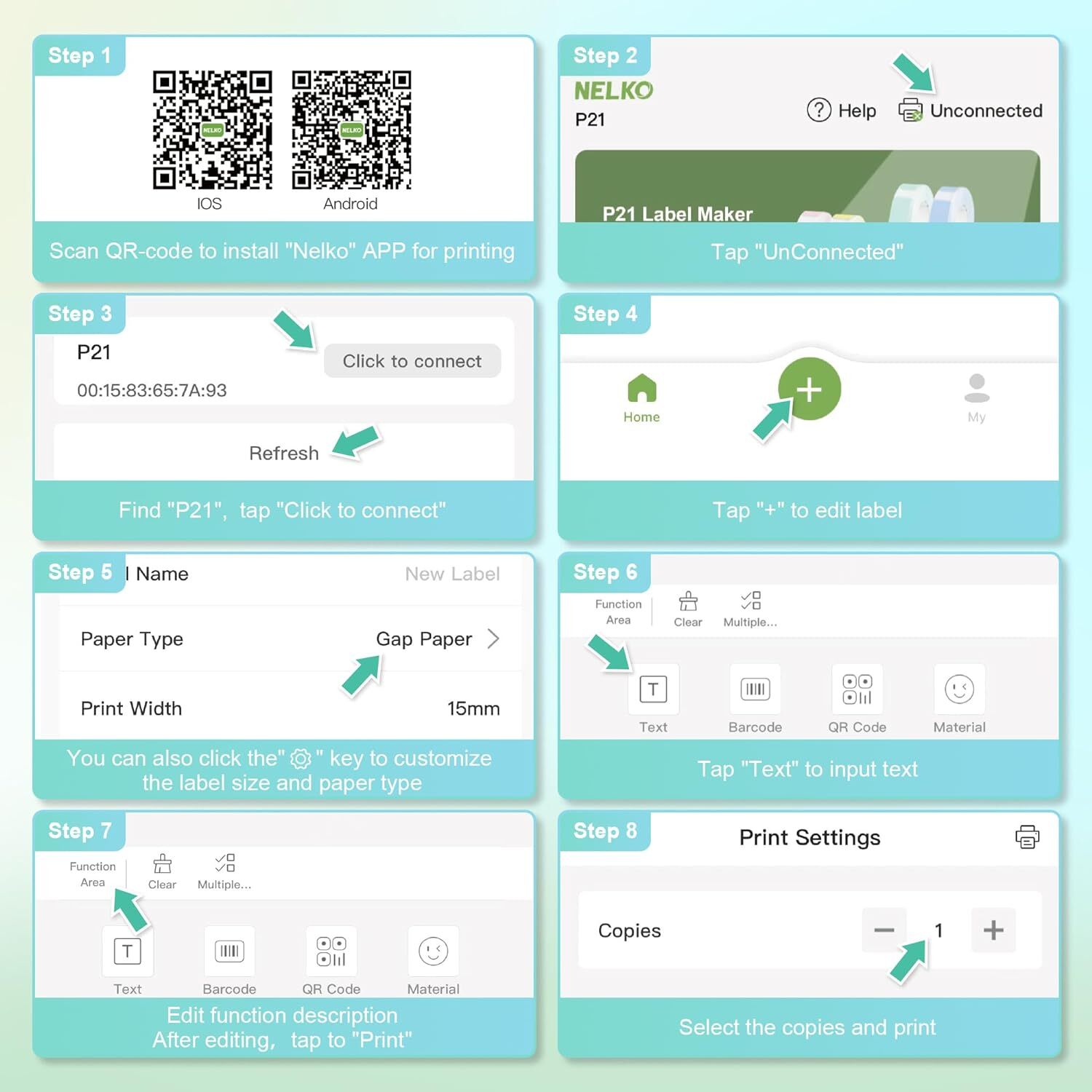 Label Maker Machine with Tape, P21 Portable Bluetooth Label Printer, Wireless Built-in Cutter Sticker Maker Mini Label Makers with Multiple Templates for Organizing Storage Office Home, Green About this item ✅【2023 New Version】Compared with the traditional label makers, half weight and size of the traditional label maker, smaller, smarter and convenient for users to carry. Wireless bluetooth label maker can slip into your pocket, allow printing anytime, anywhere. We recommend using our NELKO thermal label paper for good printing quality. ✅【High-quality Printing】Label Makers with BPA-Free Direct Thermal Technology. Equipped with high-speed chips and 203 DPI, you can enjoy high-definition without relying on ink or toner. Label maker built in durable rechargeable battery, it can work for a long time. This label maker is monochrome printout, which only prints black text. We can create color label and need to use color pattern label tapes for printing.(💡Note: Not including charging adapter, not suitable for fast charging adapter) ✅【Easy to Use】NELKO label printer compatible with IOS & Android Phone via bluetooth connection. Step 1: Download "Nelko" APP from Google Play or App Store. Step 2: Install the paper roll. Step 3: Connect the P21 bluetooth within APP. Step 4: Choose a quick template and start printing. This label maker machine with tape APP included more than 90 +Fonts, 10+ Languages, 450+ Materials. (Note: This label maker doesn't work with computers) ✅【Multiple Creative Function&Templates】This app of the label maker provides various free features and templates, easy to create various design label stickers from App with Text, QR code, Barcode, Materials, Images, Time and Borders, etc. The length of labels is fixed, including 12X40mm, 15X30mm, 15x40mm, and more. Please do not tear or destruct the green sticker on the back of the label strip , otherwise it will affect the printing effect. (Note: Continuous label tapes are not supported). ✅【Design Your Own Labels】The label maker machine with tape is widely used in life and office. For Home, organizing your clothes, food storage, cosmetics items, and mailings. For Office, office organization includes notebook tags, price tags, reminder tags, and other office supplies. For School, label maker for classroom teacher and kids school items, personal item identification, name tags. labeler makers bring you fun and convenience! Shipping fast and free shipping Return 30 Day's returns Payment safe payment via ebay Please visit our eBay store to check out other items for sale! Thank you for shopping at our store.