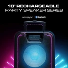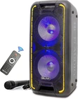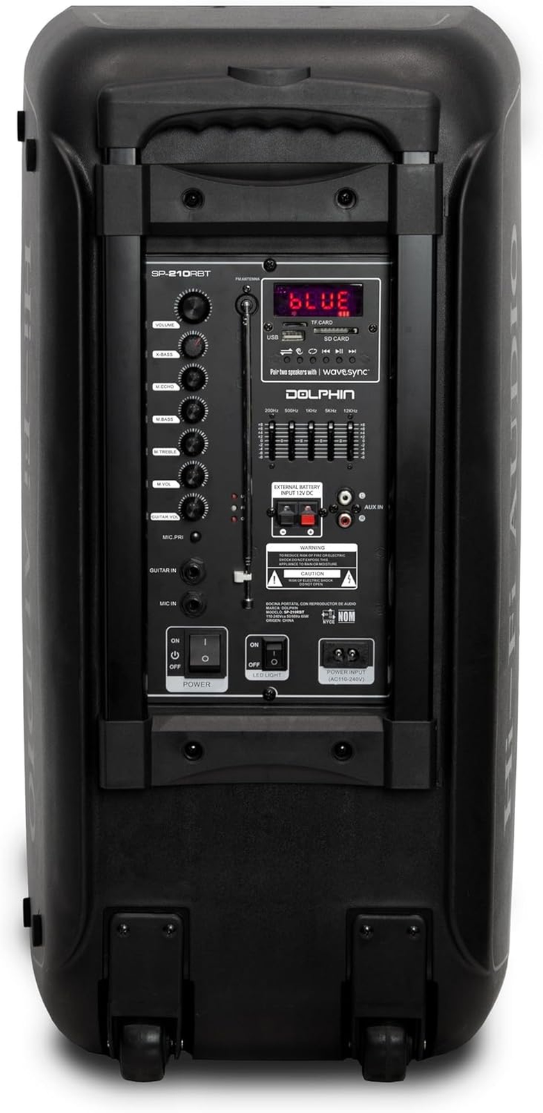 Unmatched Sound Quality: Experience powerful, room-filling audio with the SP-210RBT's dual 10" woofers and X-Bass technology, delivering crisp, thunderous sound perfect for parties, outdoor events, and karaoke nights. Dynamic LED Neon Lights: Elevate your party atmosphere with vibrant neon LED lighting that syncs to your music, offering an immersive audio-visual experience. All-Day Battery Life: Keep the music going with a robust 12V 7A rechargeable battery, offering extended playtime for all your events without the need for constant recharging. Versatile Connectivity & Playback: Stream your favorite tunes via Bluetooth, USB, SD, or Aux-in. Plus, the built-in MP3 player and two microphone inputs make it ideal for DJ sets and karaoke. Portable Design for Easy Transport: Featuring a trolley design with durable wheels and a retractable handle, the SP-210RBT is built for easy mobility, making it perfect for indoor and outdoor use. Complete Entertainment Package: Comes equipped with a wireless microphone and remote control, allowing you to manage your music and engage your audience from anywhere in the room. Product Description The video showcases the product in use. The video guides you through product setup. The video compares multiple products. The video shows the product being unpacked. How do I pair two SP-210RBT speakers? Turn on both speakers, activate Bluetooth, press Wavesync on the primary speaker. A confirmation sound indicates pairing. How to disconnect paired SP-210RBT speakers? Hold the Wavesync button on either speaker for 3 seconds to clear pairing. What are the SP-210RBT's main features? Dual 10" woofers, Bluetooth, USB, SD, FM, AUX, 7-color LED lights, 3400 Watts power, and a 7000 mAh battery. What to do if my SP-210RBT won't turn on Ensure it's charged or check the battery. For persistent issues, contact support. Can I use the SP-210RBT outdoors? Yes, it's portable with a durable cabinet and suitable for outdoor use; keep it away from extreme weather.