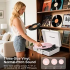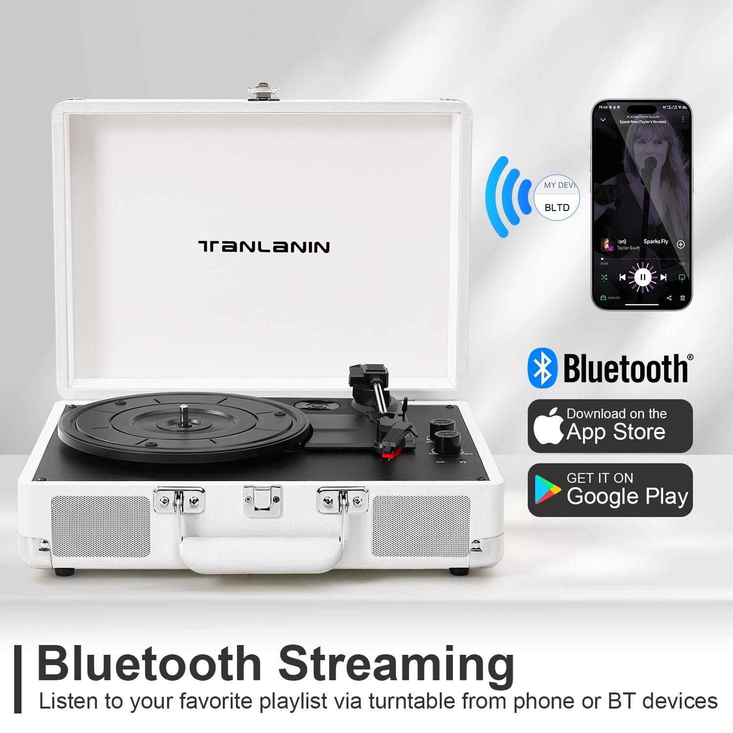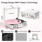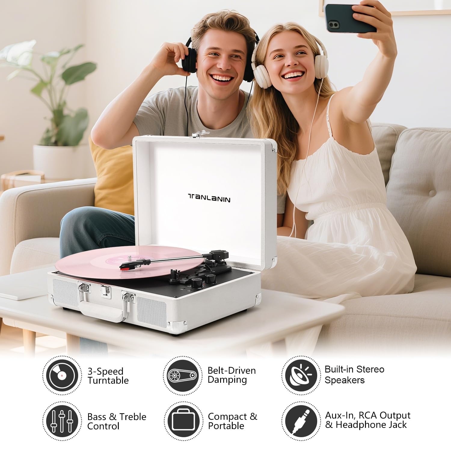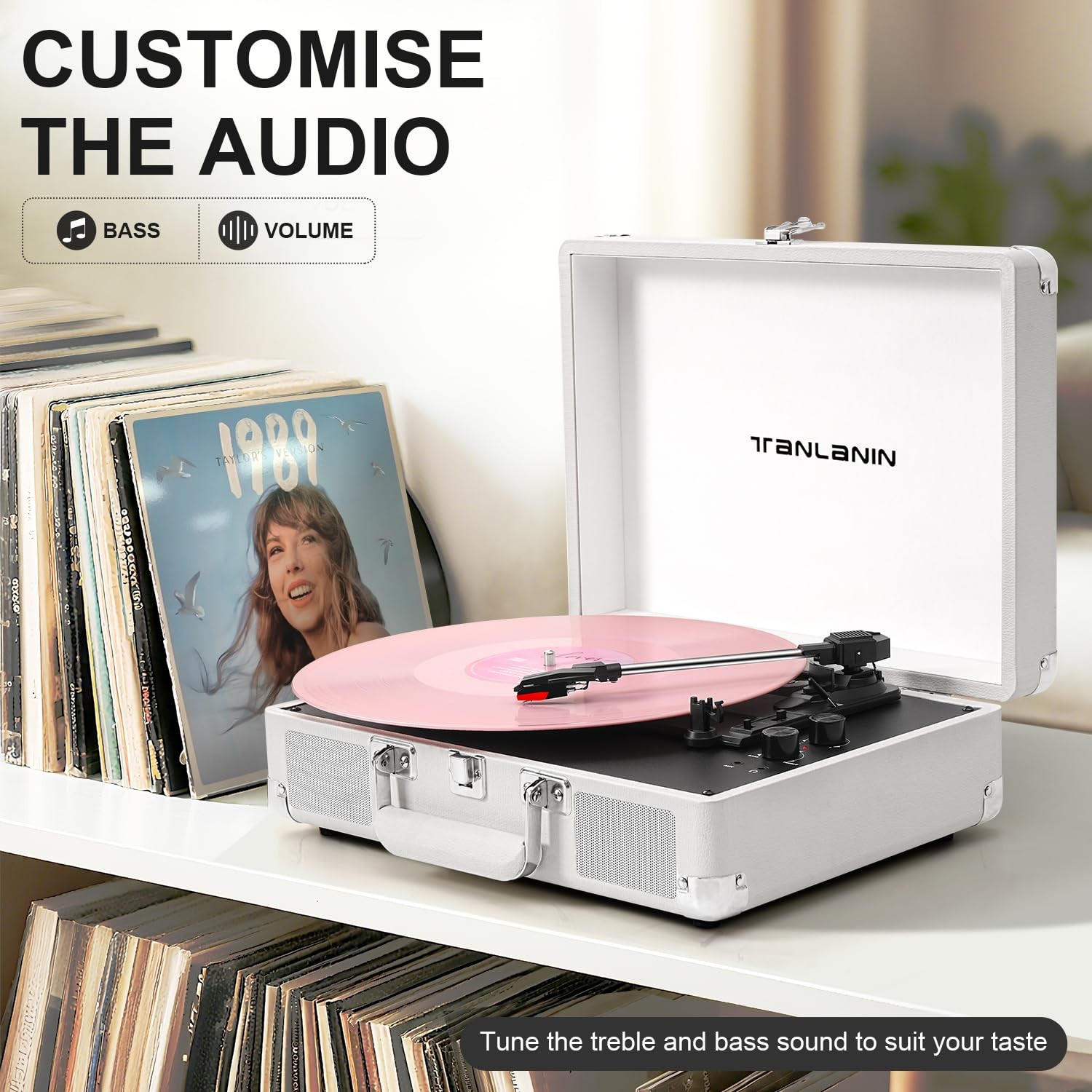 Record Player with Enhanced Speakers 3-Speed Bluetooth Suitcase Portable Vinyl Record Player Treble & Bass Control Belt Drive Vinyl Vintage Turntable AUX Line-in/Out, White 【PREMIUM SUITCASE RECORD PLAYER】 Featuring an easy-carry handle in a combination of modern and vintage elements. The classic creamy PU leather shape is complemented by shiny metal hardware and white nets, while the solid metal handle allows for convenient portability. Perfectly create a beautiful musical memories 【AII IN ONE RECORD PLAYER】Built-in enhanced speakers with Bass Control, making it ideal for both beginners and enthusiasts of vinyl records. It is suitable for use in a variety of room settings, including bedrooms, living rooms and offices 【VERSATILE CONNECTION WAYS】The record player offers multiple ways to enjoy your music. You can play your smartphone music through the turntable's Bluetooth speakers, connect external speakers via RCA or Aux-in for non-Bluetooth devices like MP3, or use headphones for listening privately 【7"/10"12" THREE-SPEED TURNTABLE】 Turntable has an upgraded belt-drive base, and compatible with three sizes of records (7/10/12") and three speeds (33/45/78 RPM). The belt-driven system enhances the audio quality, Ideal for relaxation, parties and gatherings 【BASS/TREBLE CONTROL INCLUDED】 The bass/treble knob allows you to adjust the sound quality and volume straightforward. The auto-stop switch will STOP spinning once the record has played to the end, so you can turn it on or off as you needsound straightforward. Ideal for relaxation, parties and gatherings. 【A GREAT GIFT CHOICE】 The simple design of the vinyl player is easy to use. It would make a great gift for your family and friends on special occasions. This record player is great for anyone who wants to enjoy music, explore music, or give a special gift. If you have any questions, please contact us. We are available 24/7 for you.