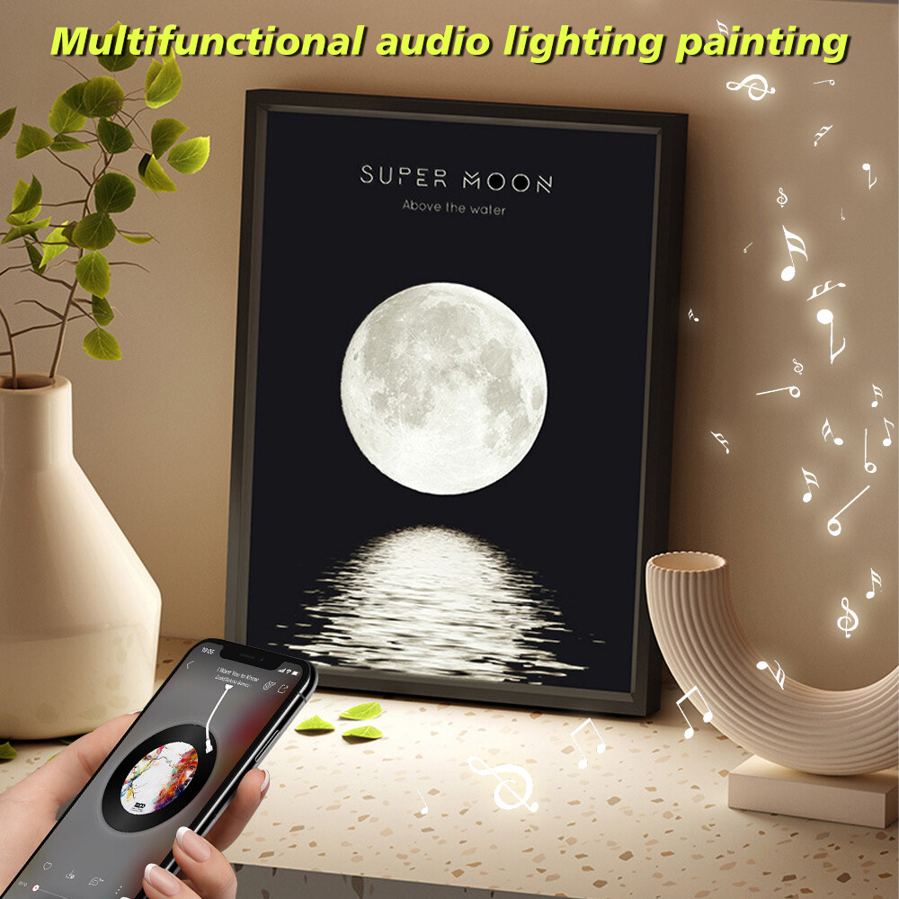Descripti on: BLUETOOTH SPEAKE R: Enhance your experience with this moving sand art decoration that includes a Bluetooth speaker base. Connect it effortlessly to your phone and play your favorite music for a fully immersive and relaxing environment. AMBIENCE LIGHT: Customize your experience with the preferred light color. The combination of soothing music, and captivating lighting creates a truly enchanting atmosphere. PERFECT GIFT: Give the gift of joy and relaxation with our affordable and one-of-a-kind paintings. Whether it's for your elders, loved ones, children, relatives, or friends, these paintings are designed to help them let go of worries and anxiety. Wish them a peaceful, simple, and fun year ahead with this delightful present. Specification: Mounting method: framed Outer frame material: Aluminum alloy Core material: PS panel Number of frames: single frame Decorative Painting Category: Lighting and Sound Painting Decorative painting techniques: carving, printing Connection method: Bluetooth 5.0 supports BLE, BR, EDR Switch: button Power supply: USB interface Border color: Black and White Color temperature: 3000K Speaker: Bluetooth Speaker Bluetooth module: Input rated voltage: 5V; Rated input current: 2A Power amplifier module power: 3W * 2 The Bluetooth version supports A2DP, AVDTP, AVRCP, RFOMM, HEEP, HSP, SPP, HID Bluetooth name: SG-MUSIC; Wireless version: lighting+audio, with a battery life of 21 hours Package: 1x Luminous sound painting