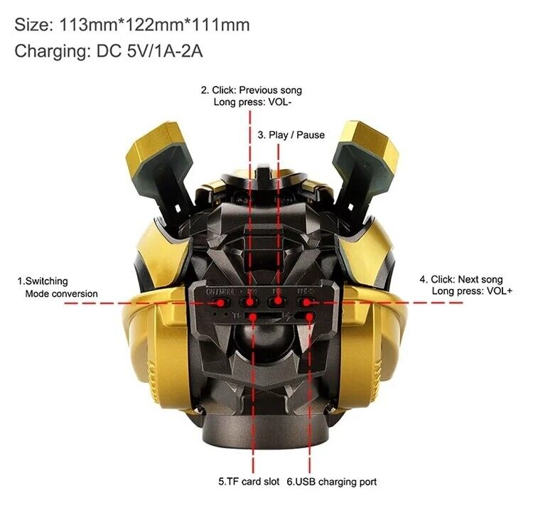 Product Description Main features TF card(32G). USB. FM Support interconnection Product material ABS + metal oil V5.0 Transmission distance 10 meters Speaker Specifications Ø52mm Amplifier specifications 4Ω/5W Battery specifications 1200MAH Play time 3-5H Product size 113*122*111 MM