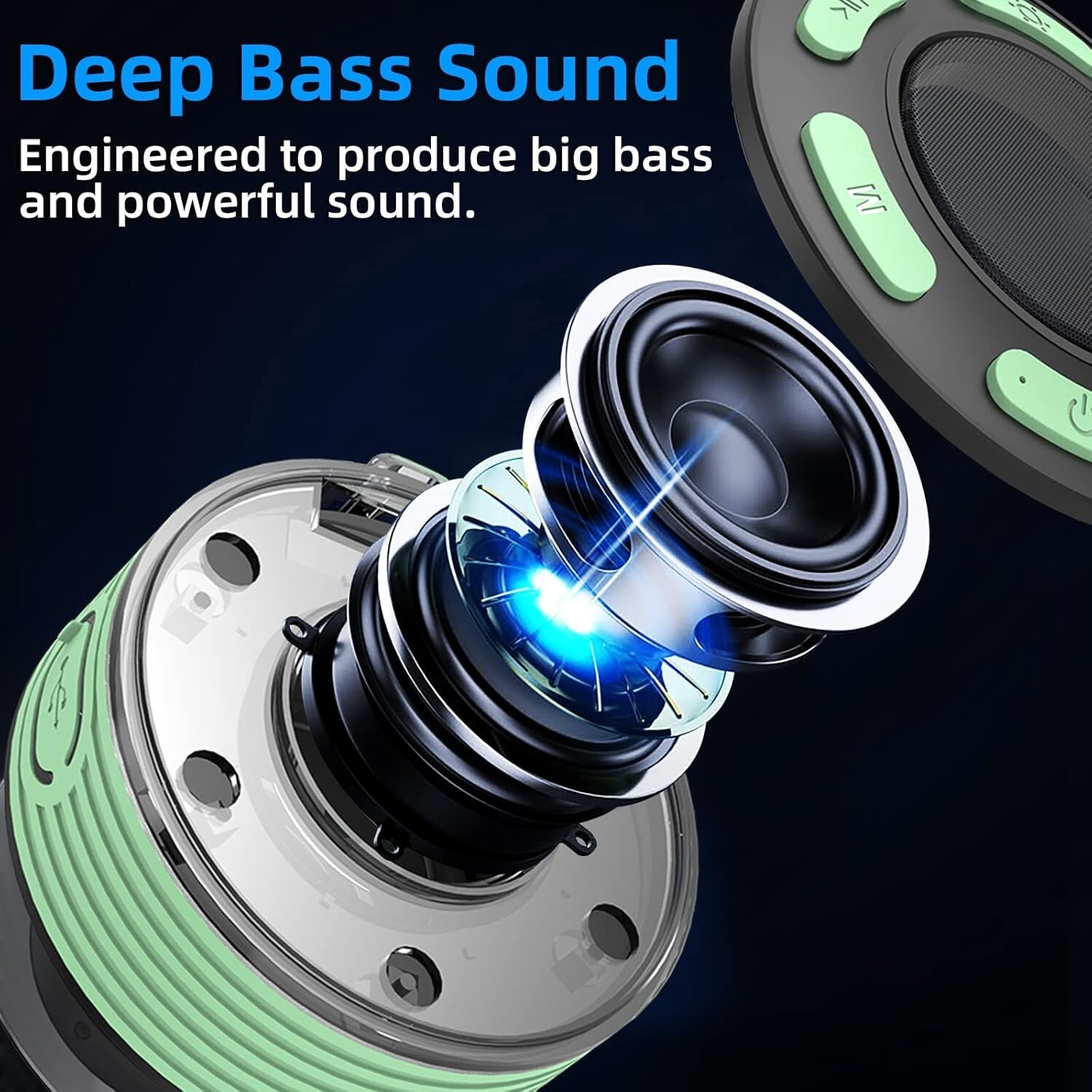 Bluetooth Speaker, IP7 Waterproof Wireless Speaker, Portable Speaker, HD Surround Sound, LED Light Mini Speakers, Dual Stereo Pairing, Built-in Mic, Radio, Green true 360°stereo sound and amazing bass sound: wireless speakers use digital audio processor pumps up the bass and enhances the clarity of the mids and highs, delivers distortion free stereo sound even at high volume. with 5w driver and passive radiators, bluetooth speaker delivers surprisingly loud clear stereo sound even. ip7 waterproof: the wireless speakers is resistant to splash, rain, gentle spray, therefore is applicable in shower room, by the pool or beach, and even in the rain. however, in order to extend the use life of the waterproof wireless speaker, please don't put directly it in water. this waterproof speaker is also a shower speaker! pairing mode: easily pairing function, it will show you unprecedented music feeling. you can purchase two mini speakers at the same time to enjoy the surround sound of a movie theater. every time the two wireless bluetooth speakers are turned on, they will be connected automatically by themselves before they connect to any other bluetooth devices. wirless connection: our design with bluetooth provides fast connection and incredible wireless bluetooth range, and efficient connection to bluetooth cell or devices. portable speaker bluetooth also have memory function, can also remembers your last device, allowing you to reconnect effortlessly. multi funtion: the wireless speakers has five light modes, gradient lights would truly bring you party atmosphere. come with a suction cup, easy to attach in bathroom tiles and mirrors. great also as a mini speakers in the car as it suctions to your car windscreen. built in mic for handsfree calls from . compact, handheld size.