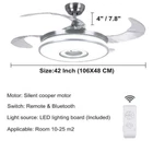 42"Bluetooth Speaker Invisible Ceiling Fan Chandelier With Music Player Remote Features Function: Built in Speaker,just need to connect bluetooth to play any music from your mobile devices Color: Silver Fan Expanding Size: Diameter 107cm /42inch Lamp shade diameter:49CM819.2inch Lamp fixture Height:40cm(Size included 10cm down rod) Down rod:10cm/3.93inch,20cm/7.87inch Ligthing source: LED light panel boardIncluded Voltage:110V Power:36W Material: Hardware / Acrylic / Blade ABS Switch: Remote Control Light color: White,neutral,warm light(Change by remote) Fan speed: L-M-L Irradiated area: 20-30 Square Meter Control mode: with remote control, LED light plate three-tone light (white light, neutral light, warm light) LED light plate wattage (36W), lumen (3500lm), airflow (CFM) wind flow in 5000CFM Size after installation: 107cm/42in (diameter after fan blade expansion) *36cm /14.17in(height) around the mobile phone scan code in the package of Bluetooth installation manual "two-dimensional code" download APP, mobile phone can play music, mobile phone control lights Superior features: no radiation, no flicker, no glare, no dark areas, green, low emissions, 50000h life, low power consumption. Applicable: living room, bedroom, restaurant, etc. Packaging details:1 * fan light pack in foam carton box. Suggestion: Ceiling bearing ≥25KG Floor height ≥ 2.6cm Installation By A PROFESSIONAL ELECTRICIAN Assistant after sales: For any question or installation methords about the light fixture,pls contact us via ebay message firstly for help. Payment Delivery details Terms of sales About us Contact us Payment You could make payment via: Delivery details Packages will ship via by UPS or USPS within our handling time,once the package is shipped out ,normally shipping takes about 3-10 working days,but due to different cities and states,shipping time will be different. Terms of sales If you any problem about shipping information, or the item you got : Arrived damaged; Wrong item sent; Missing parts or pieces; Doesn't work or defective; Doesn't match description or photos. Pls click "Contact Seller" and send us message firstly. Then we could have a check and will take responsibility to resolve the problem with you in good communication. About us Our company specializing in selling all kinds of light fixtures,such as ceiling fans,chandeliers,crystal lights,retro lamps,pendant light,etc. If there's any light fixture you are interested,pls feel free to contact us for more details. Contact us Normally your message will be replied in 1 business day,If after 24 hours you do not receive our reply,please kindly re-send us the message,because sometimes ebay message system will have technical problem,so your message can't send to us successfully.