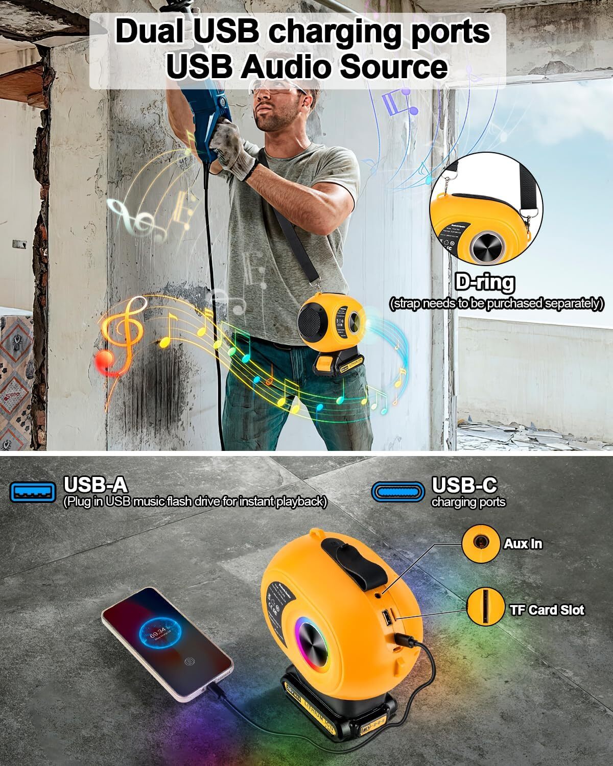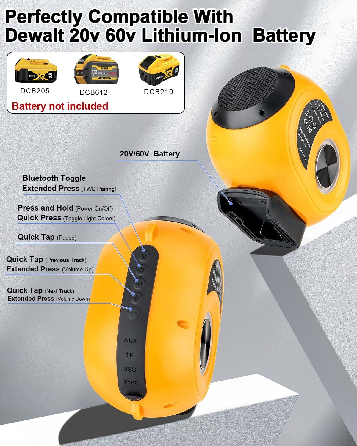Store New Arrivals Add to Favorite View Feedback Contact Bluetooth Speaker for Dewalt 20V Battery,Wireless Speaker with HD Sound, TWS Pairing, Bluetooth 5.3, for Jobsites/Home/Party/Outdoor/Beach/Gift(Battery Not Included) Description Item model number YXDZ-009 Number of Items 1 Power Source Battery Powered Country of Origin China Is Electric Yes Bluetooth Range 66 Feet Controller Type Battery Powered Connectivity Protocol Bluetooth, USB Wireless Communication Technology Bluetooth Material Plastic Includes MP3 player? Yes Model Name Portable Bluetooth Speakers Recommended Uses For Product For Music Players Speaker Maximum Output Power 30 Watts Item Weight 1.11 pounds Connectivity Technology Bluetooth Special Feature USB Port Mounting Type Floor Standing Color Yellow Speaker Type 3D Maximum Range 66 Feet Is Waterproof FALSE Audio Output Mode Surround Included Components 1 x Bluetooth Speaker, 1 x User Manual, 1 x Portable Strap Product Dimensions 6.96"D x 6.6"W x 4"H ♪【Immersive Sound & TWS Connectivity】 - Experience rich, distortion-free sound with this wireless bluetooth speaker's dual drivers and advanced tech. Connect two for stereo sound, perfect for gaming, music, or movies. ♪【Unlimited Playtime】 - The Portable cordless bluetooth speaker is perfectly compatible with Dewalt 20v 60v flex batteries DCB203 DCB204 DCB205 DCB206 DCB606 DCB609 etc.Unlimited playback time if you have multiple backup batteries.(Batteries not included) ♪【Power Bank & USB MP3 Player】 - USB-A and USB-C ports provide fast emergency charging at 5V/2.1A. The USB-A port can also play music from a USB flash drive for portable entertainment.You can also play music from other devices using the AUX jack (not included). ♪【30W Audio Driver&Bluetooth 5.3】-Bluetooth 5.3 technology ensures instant pairing and maintains a strong connection within a range of up to 66 feet.30W Big power blueooth speaker can provide very powerful stereo and amazing bass sound. It will bring you an unprecedented listening experience. ♪【Everything You Need】 -Package includes 1 Bluetooth Speaker, 1 Portable Strap, and Quick Start Guide, with lifetime tech support. Ideal gift for music lovers and tech enthusiasts. Additionally, the speakers feature built-in low-voltage protection for battery safety. It's advisable to store batteries separately during prolonged periods of non-use. Product Description Compatible with All Dewalt 20v/60v lithium-ion batteries DCB203 DCB204 DCB205 DCB206 DCB210 DCB208 DCB201 DCB240 DCB207 DCB230 DCB205NNO DCB201NNO DCB203G DCB205BT DCB203BT DCB200 DCB606 DCB609 DCB612 DCB615 etc. Q: How to Pair Two Bluetooth Speakers? A: Turn on both speakers. Ensure they are not currently paired with any device. Press and hold the TWS Pair/Pause button until you hear a short tone indicating the start of the pairing process. Wait for 2-3 seconds; a long beep will confirm that the speakers are successfully paired with each other. Go to your device's Bluetooth settings, select "YXDZ-009," and complete the pairing process. Q: Does the speaker remember Bluetooth devices? A: Yes, after the initial pairing, the speaker will automatically reconnect to the last paired device the next time it is turned on. To connect a new device, disconnect the current one and follow the pairing process for the new device. Q: Does it have a shut-off function to prevent battery damage? A: Yes, the speaker features a low-voltage protection function that automatically shuts off the power when the battery voltage drops below 15V, preventing battery damage. It is also recommended to remove the battery if the speaker will not be used for an extended period. ABOUT US We offer the best prices around on high quality products. Our E-store includes media such as books, movies, music and games while offering electronics, toys, sporting apparel, clothing, tools, general home, garden items and more. SHIPPING We are always working hard to ensure your package arrives as soon as possible. Please understand that some factors like weather, high postal traffic, and the performance of shipping companies are outside of our control. We offer free shipping to the lower 48 states and ship within 2 business days of payment, usually sooner. We do not accept P.O. Boxes. Please provide a physical address. For shipping outside of the continental USA, we only use eBay's Global Shipping Program.The item is shipped to KY and then sent to the rest of the world. International customers are responsible for all duties and taxes. Continue to check out in order to calculate costs for shipping the item to your country. Messages regarding eBay's Global Shipping Program MUST be directed at eBay EXCLUSIVELY. RETURNS We offer a 30-Day Return Policy on items which you are not completely satisfied with. You have the option for a full-refund or an exchange of the item. No returns are available on items shipped outside of the USA. PAYMENT We accept PayPal. CONTACT US This page content is yet to come Please ad us to your favorite seller and visit again later Thank You CUSTOMER SATISFACTION We try our very best to make sure every customer is completely satisfied. If there's a problem, message us! We're happy to help. WE ACCEPT Copyright © 2021 AutoDS. | All Rights Reserved