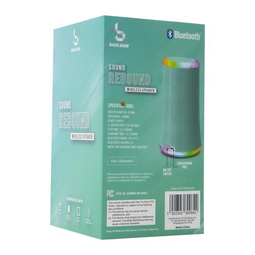 Bluetooth Speaker LED color True Wireless Portable Stereo, Teal Color product details get big sound for a tiny price with a sound rebound LED bluetooth speaker. turn off the lights & dance in the dark to the color changing LEDs! it's wireless, so you can bring it anywhere you go. features high quality sound, LED breathing light includes micro-USB charging cable compatible with iPhone®, iPad®, android™ smartphones, tablets & wireless audio players specs: driver diameter: 52mm; impedance: 4 Ohms; power supply: Li-ion battery 3.7V 300 mAh; playtime: 1.5-2 hours; charging time: 1.5-2 hours; bluetooth range: 32.8 feet; bluetooth version: 5.0