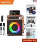 Bluetooth Speaker with Two Wireless Micros, Outdoor Speaker with Subwoofer/Tweeter, Portable PA Speaker System with Remote Control, Discol Lights, FM, REC for Home, Party Superb HD Stereo Sound Quality: The portable bluetooth speaker is equipped with a high-performance audio driver and an advanced digital signal processor, which make the sound clearer, the bass stronger, the volume more moderate, and eliminate all the noise. Built-in ” subwoofer and 2” tweeter, which can amplify your voice, play the radio as well as stream songs and it does not distort the audio even at higher volumes. You can enjoy strong, loud, and transparent bass and treble. Multi-function Bluetooth Speaker: Built-in the latest Bluetooth chip for wireless streaming ensures instant pairing and provides a more stable transmission and longer distance. This big speaker also supports a Micro TF card, Flash USB, and AUX-in connectivity. Compatible with the android mobile , TV, iPad, tablet, PC. There is a micro input on the operation panel, which also works for guitars. The unique groove design on the karaoke machine allows you to place your . Lightweight & Large Capacity Battery: The outdoor speaker shell is made of exquisite and durable solid wood/leather. It weighs KGS and is attached shoulder strap. Light, portable and compact. You can easily carry it to the beach, outdoor ect. High-performance battery (built-in rechargeable large-capacity lithium-ion battery), low power consumption, maximum power for a single charge to continuously play music for 6-8 hours (standby 72 hours, normal play time is 10 hours). Colorful Disco Lights: This PA speaker system is equipped with colorful disco lights. Independent button to switch lights. The colorful LED lights create pleasant and romantic karaoke and party vibe for this karaoke machine,you can enjoy a colorful and cheerful party. TWS Mode: By connecting two same big bluetooth speakers, the powerful and stereo sound will be synchronized and surround you by 2 channels. You can enjoy music with the best sense of presence, power and volume. (NOTE: If you are not satisfied with this karaoke speaker or have any other questions, please feel free to contact me before return. we promise to offer you satisfactory solutions.)