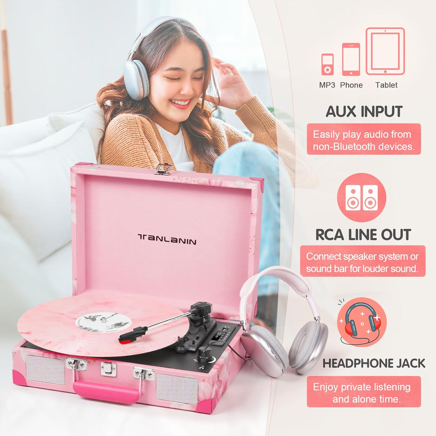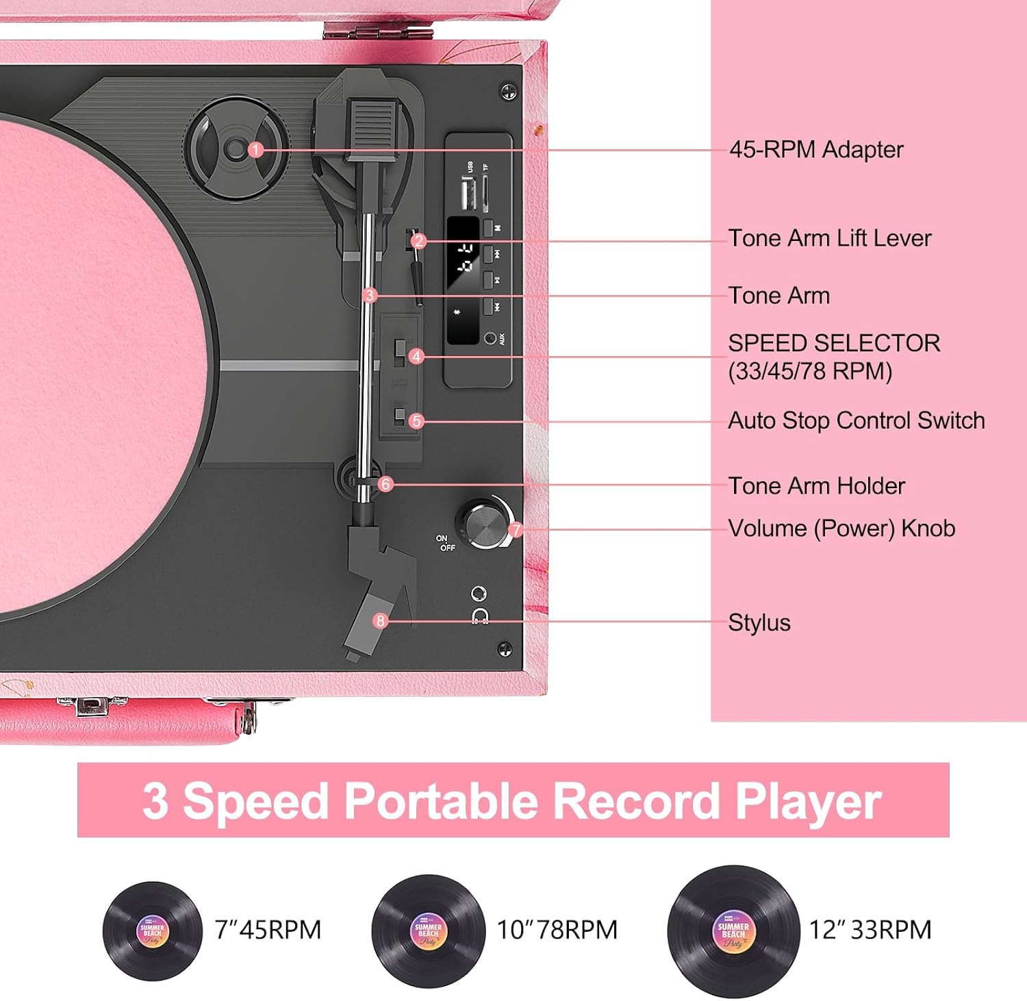 Store New Arrivals Add to Favorite View Feedback Contact Record Player with Enhanced Speakers 3-Speed Bluetooth Suitcase Portable Vinyl Record Player USB Recording Belt Drive Vintage Turntable AUX Line-In/Out EQ, Light Pink Description Item model number TE-001D Style Retro Maximum Rotational Speed 78 RPM Color Pink Product Dimensions 13.5 x 10.5 x 5 inches Material Engineered Wood, Plastic, Metal Item Weight 6 Pounds Connectivity Technology RCA, Bluetooth, Auxiliary, USB Model Name TE-001D Special Feature Headphone Jack Output, Anti-Resonance, Digital Recorder Included Components function(f) {var _np=(window.P._namespace("DetailPageProductOverviewTemplatesJava"));if(_np.guardFatal){_np.guardFatal(f)(_np);}else{f(_np);}}(function(P) { P.when('A').execute(function(A){ A.on('a:truncate:po-attribute-truncate-3:updated', function(data) { var isTruncated = !data.truncateInstance.getIfTextFits(); var seeMoreElement = document.getElementById('po-attribute-see-more-id-3'); if(seeMoreElement) { seeMoreElement.style.display = isTruncated ? '' : 'none'; } }) }); })); 1x Linen Suitcase Turntable, 1x 7-inch Turntable Pad & Extra Stylus, 1x 45RPM Adapter & DC 5V 1A Power Adapter, 1x User Manual See more 【Upgraded Suitcase Record Player】 Featuring a combination of modern and vintage elements. Easy-carry metal handle with classic pink PU leather complemented by suitcase design and white nets. Perfectly create a beautiful musical memories iand suitable for a variety of room settings, including bedrooms, living rooms and offices. 【USB Recording, Vinyl To MP3】Built-in enhanced speakers and digital recorder, the record player allowes you to directly convert all vinyl records into MP3 or WAV format and instantly save on USB drive or SD card. It's a great way to digitize your vinyl and play them on PC or other speakers. 【Versatile Connections Options】It offers multiple ways to enjoy your music.You can play your smartphone music through the turntable's Bluetooth speakers, connect external speakers via RCA or Aux-in for non-Bluetooth devices like MP3, or use headphones for listening privately. 【7"/10"12" Three-Speed Turntable 】Turntable has an upgraded belt-drive base, and compatible with three sizes of records (7/10/12") and three speeds (33/45/78 RPM). The belt-driven system enhances the audio quality and ensures the vinyl playback smoothly. 【LED Display, Bluetooth, EQ Included】The auto-stop switch will AUTO STOP spinning once at the end of a record. The LED display provides clear status information on the operation. Streaming wiresless Bluetooth music to the turntable with EQ mode available. Great to use at relaxation, party and gathering etc. Product Description Original Design Portable Suitcase Record Player Decorate your room with a pink record player. It would add a vintage vibe to your contemporary space while giving you the opportunity to enjoy your favorite music. Add this charming item to your room today! Aesthetic Appeal Stylish pink design tailored specifically for girls. Portable suitcase format for easy transportation. Premium Craftmanship Wireless and convenient Bluetooth Streaming your favorite playlist wirelessly from smartphone or tablet,etc. It will Auto Sync with your Bluetooth device after first pairing. Vinyl LP to MP3 Converter USB Music Recorder backup vinyl records to USB flash drive / SD card into MP3/WAV files. LED Display for good visual of the status and easy operation. Built-in Speakers and RCA out Requires no additional speakers as two stereo speakers are already built-in. RCA output provides the option to connect with external speakers. Headphone Jack/RCA/AUX Headphone jack connect to earphones for private listening or other speakers' line-in port. Great Ideal Music Choice Uniuqe Vintage VInyl Music Player Perfect Choice For : Daughter, Granddaughter, Mom, Sister, Girlfriend, Wife, Friend, Colleague, etc. Occasion: Birthday, Mother‘s Day, Valentine's Day, Christmas, Thanksgiving Day, Anniversary, Graduation, Wedding,. etc ABOUT US We offer the best prices around on high quality products. Our E-store includes media such as books, movies, music and games while offering electronics, toys, sporting apparel, clothing, tools, general home, garden items and more. SHIPPING We are always working hard to ensure your package arrives as soon as possible. Please understand that some factors like weather, high postal traffic, and the performance of shipping companies are outside of our control. We offer free shipping to the lower 48 states and ship within 2 business days of payment, usually sooner. We do not accept P.O. Boxes. Please provide a physical address. For shipping outside of the continental USA, we only use eBay's Global Shipping Program.The item is shipped to KY and then sent to the rest of the world. International customers are responsible for all duties and taxes. Continue to check out in order to calculate costs for shipping the item to your country. Messages regarding eBay's Global Shipping Program MUST be directed at eBay EXCLUSIVELY. RETURNS We offer a 30-Day Return Policy on items which you are not completely satisfied with. You have the option for a full-refund or an exchange of the item. No returns are available on items shipped outside of the USA. PAYMENT We accept PayPal. CONTACT US This page content is yet to come Please ad us to your favorite seller and visit again later Thank You CUSTOMER SATISFACTION We try our very best to make sure every customer is completely satisfied. If there's a problem, message us! We're happy to help. WE ACCEPT Copyright © 2021 AutoDS. | All Rights Reserved