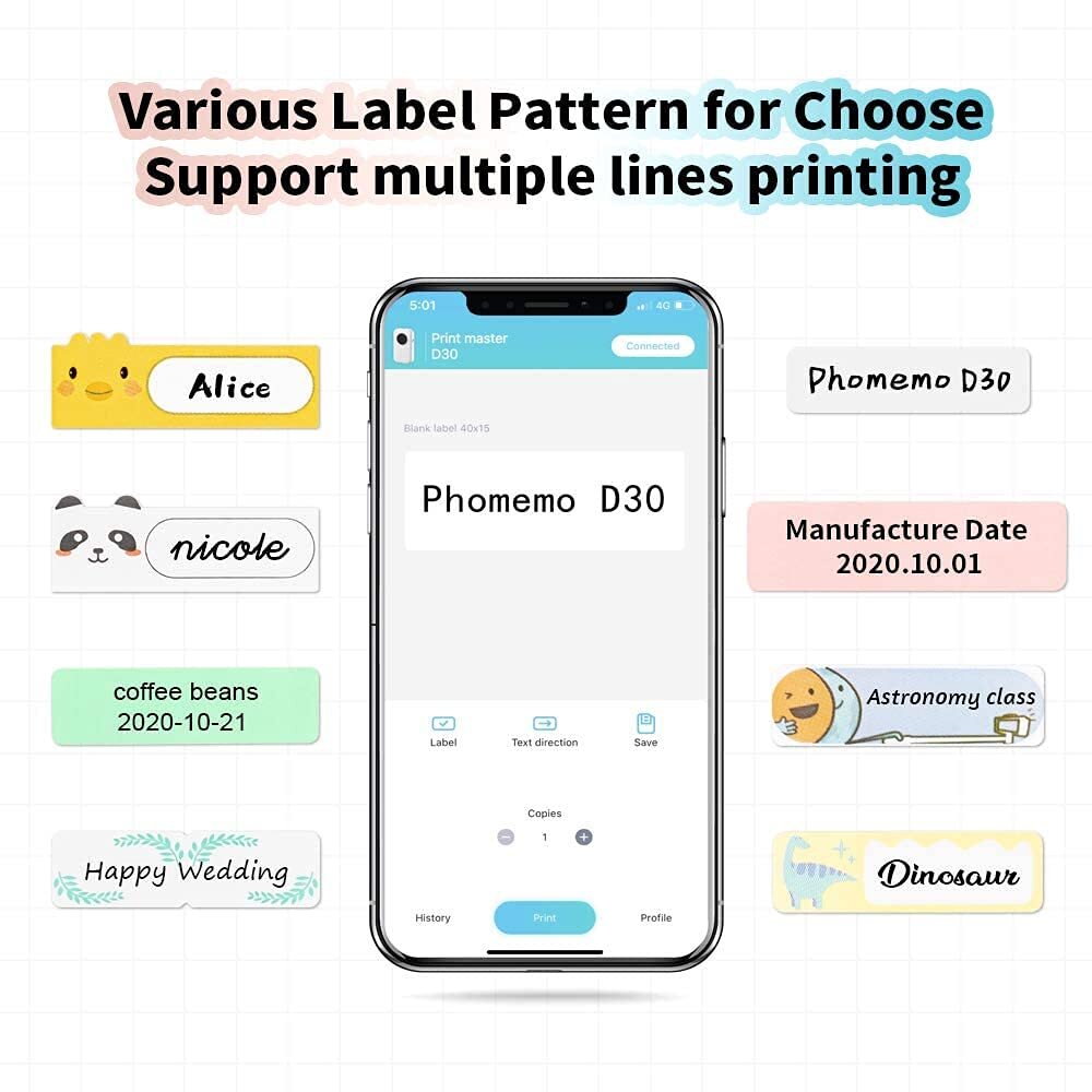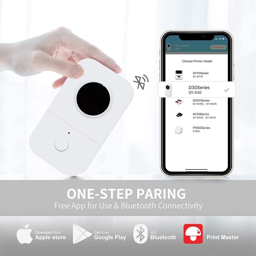 Product Information Printer Output Type: Monochrome Printing Method: Direct Thermal Printing Label Width: 6mm、12mm、14mm、15mm Print Speed: 60mm/s Print Head Life: 50KM Data Transfer: Bluetooth 4.0 Resolution: 203dpi Wireless Distance: 10m Battery: Built-in 1200mAh Rechargeable Battery Item Size: 5.2*3*1.2 Inch/131*75*29mm Net Weight: 5.6oz What we support ★Save money – D30 mini printer don’t need ink, toner or ribbon. ★Powerful APP – Providing 16 sizes labels; In addition, you can change the text direction. And have the function of large-capacity continuous printing. ★Wireless Printer – Connect your portable printer with your iPhone & Android via Bluetooth 4.0. ★Compact Size - 5.2*3*1.2 Inch, and weight of 5.6oz. You can put it in your pocket or handbag. ★Long Endurance – Built-in 1200mAh large rechargeable battery, you can keep printing for 4 hours, means printing 50 rolls paper, the total is length of 400m. Package List: 1* Label Printer 1* Roll Printer Paper 1 * User Manual 1 * USB Cable after Sales Service Please us via on if you meet any problem, we will provide you with a solution within 12 hours. Besides we also provide return/service if the product has any quality problem. 2024 Upgrade Version Label Maker - The portable bluetooth label maker Support continuous label tape and labels in fixed length. It is half weight and size of the traditional label maker. DPI increased 25% for more clear image. Built-in recharge battery long working time. Save Money - Thermal technology - doesn't require ink, toner, or ribbons, Lower cost compared to inkjet printers. Los of thermal color paper for your choice (This label maker is Monochrome Printing Output, which only prints black text. We can create color-label artwork, printing with color-patterned label tapes is required. ) Wireless & Portable - Mini size wireless bluetooth connected label printer for Convenient & Fast printing, Create Labels from Mobile Devices, easy for custom label. High Quality Printing - This Small thermal label printer provides superior print clarity resulting in hassle-free printing- high quality crisp, dark imaging and smooth printing effects and fast processing. Widely Use in Life – D30 handy printer can printer 16 sizes thermal paper, and we also provide you many different color label paper. You can use it in home/office organization.