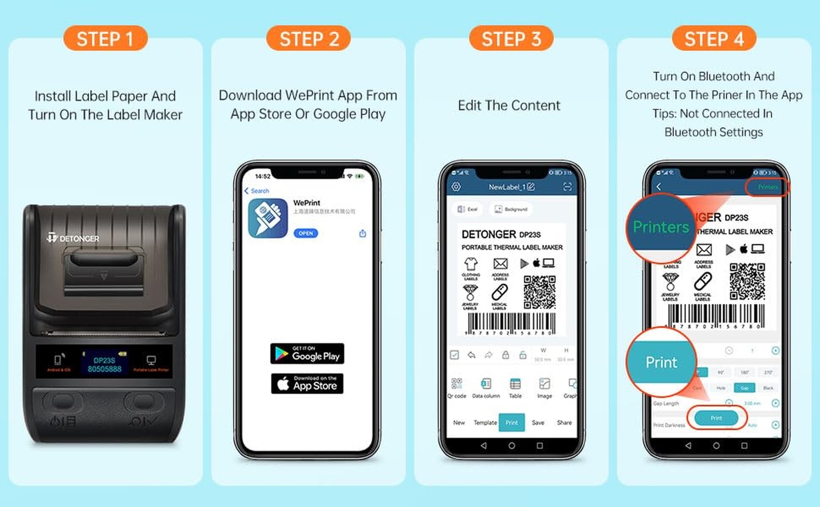 DP23 Label Maker, Bluetooth Portable Thermal Printer Sticker Printer for Home Office Organization Clothing Jewelry Retail Barcode Sticker Maker Machine with 2'' x1.18'' Labels-200pcs/Roll Product Details Brand: DETONGER Connectivity Technology: Bluetooth Printing Technology: Thermal Special Feature: Portable Color: Pink Model Name: DP23 Printer Output: Monochrome Maximum Print Speed (Color): 1 ppm Max Printspeed Monochrome: 100 ppm Item Weight: 0.34 Kilograms Product Dimensions: 5.8"D x 5.1"W x 3.2"H Controller Type: WePrint Printer Media Size Maximum: 1.97 x 3.94 inch Print media: Labels Display Type: LED Sheet Size: 5 x 3, 4 x 3, 5 x 8 Inches Wattage: 11.1 watts Hardware Interface: USB Type C Control Method: App Specific Uses For Product: Enterprise Home School Retail Jewellery Cable Item Weight: 12 ounces Item model number: DP23P203 Batteries: 1 AA batteries required. (included) Date First Available: January 11, 2025 Manufacturer: DETONGER Country of Origin: China Easy to use -one-click printing, saving time and effort. Smart app offers variety of fonts and themes. Using app: Install "WePrint" App from Apple Store & Google Play->Turn on DP23P printer and open bluetooth connection. Choosing printer model DP23P from app->Enjoy Printing. Wide Application: DETONGER DP23P Label Maker supports label width up to 48mm, which can be widely used for food labels, spice jars, bottles, clothing storage boxes in the home, price labels, jewellery labels, product information, QR codes, bar codes, brand logos in small businesses, name labels, clothing labels in schools, and office supply labels. Not only in life but also in work, it can meet our different needs very well Inkless and Bluetooth Label Maker: Using direct thermal technology with a high-speed chip, it provides 203 DPI print quality. Enjoy high speed and convenient printing without relying on ink or toner. This printing solution is economical, making it ideal for home and small business use.No buttons needed, all functions can be controlled via Bluetooth connection to our "WePrint" APP Powerful APP: Without login, registration, or subscription required,you can use a vast array of built-in templates for industrial, home, school, retail, jewellery, supermarket, clothing, food, cables and many other different scenarios.It also supports a variety of fonts, symbols, frames, and icons, giving you more freedom to customize your own personalized labels Portable Label Printer: 1500mAh*7.4V rechargeable battery, it can work continuously for 4-5 hours in fully charged condition. Controls directly from your phone, no need to plug in cables like traditional printers allows you to take it to any different usage scenarios No Sign-Ups and No Hassle: Enjoy instant access to a vast collection of built-in templates, fonts, borders, icons, and multiple languagesno registration or in-app subscriptions required. This label printer supports all non-chip label paper, as long as the size fits, giving you the freedom to choose the most suitable labels for your needs. Simple, flexible, and hassle-free labeling for home, office, and business