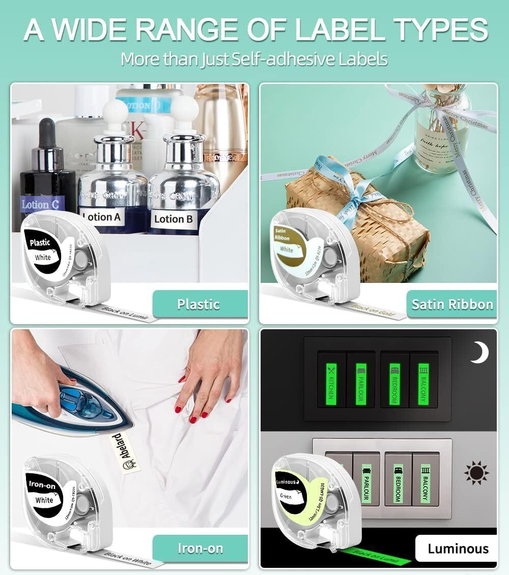 Product Description Mini & petal shape Inspired by the petals of a blooming flower, the P12 label maker with its unique shape is perfect for a friend. Print label Bigger and clearer With an effective print width of 10 mm, the P12 labeler can print larger fonts than the 5 mm effective print width of keyboard machines. Saving labels Compared to other labellers, the P12 label maker prints labels with shorter white space on the left and right sides, which reduces label waste. Dual-mode printing technology Thermal transfer: Requires the use of a thermal ribbon, which is more durable. Thermal printing: Use of direct thermal media without ribbons. Previous page Next page 1 Self-adhesive label 2 Satin ribbon 3 Reversible label 4 Luminous label P12 Label Maker Machine with Tape Printing technology: Thermal printing and thermal transfer printing Consumables Labelling tapes: No ink or toner required Number of printed lines: 1-3 lines of text printing Resolution: 203dpi Application: Kitchen labels, food labels for the fridge, iron-on name labels for clothing, ribbons for decoration, office, garden, etc. Power supply: USB plug-in power supply or battery operated (USB cable included) Intelligent energy: Saving Automatic switch-off when not in use Print width: 12mm Connectivity: Bluetooth Note: users must be authorised by GPS when using the Print Master APP. does NOT receive any of your private information. The iOS system does not require this. Label Maker Tape for P12 Label Maker