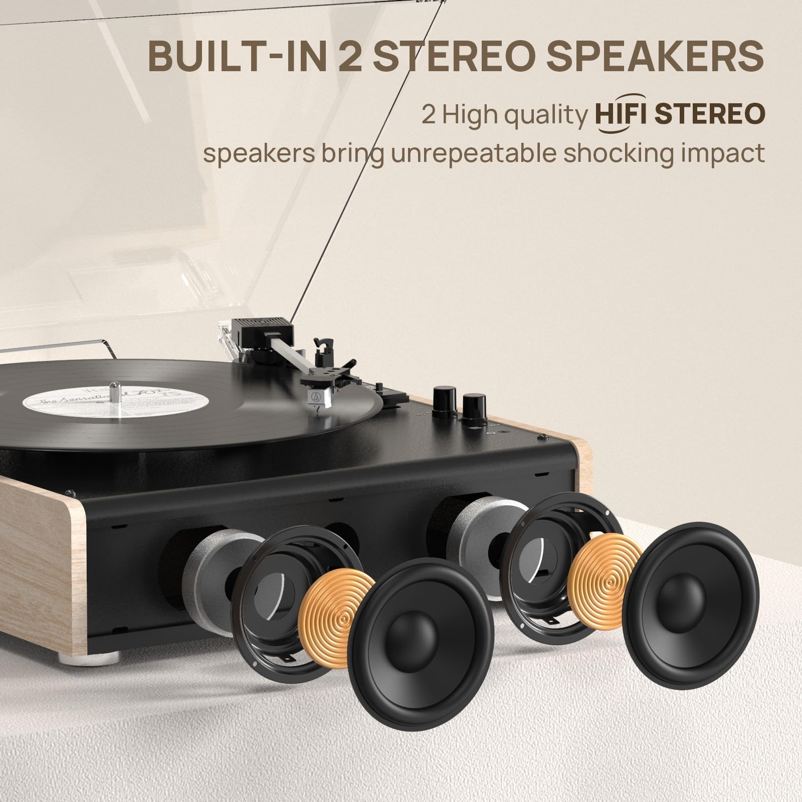 Vinyl Record Player Bluetooth Wireless Turntable with Built-in Speakers and 3 Speed Belt-Driven Vintage Phonograph Record Player with Magnetic Cartridge, RCA Out, Aux in, Headphone Jack 【High-quality magnetic stylus】- The AT-3600L stylus can accurately track the grooves of the record, preventing skipping and achieving high-definition audio. The universal stylus shell allows users to easily replace the stylus 【High-Fidelity speakers】- The vinyl record player with 2 built-in 3-watt stereo speakers allows you to enjoy high-fidelity sound quality and bring you a perfect music experience. The vinyl record player combines a turntable, a preamplifier and a speaker, and even a novice can quickly learn to use it 【3-speed & 3-size player】- Supports 3 playback speeds (33/45/78RPM) and 3 sizes of records (7/10/12''), the unique built-in 45RPM adapter does not require manual installation, just turn it clockwise to rise and counterclockwise to fall, which is very easy to use 【Four available connection options】- Wirelessly play music from other devices via Bluetooth 5.3, Aux-in port, or connect external speakers with RCA cables for better or louder sound. 3.5mm Headphone Jack can be connected to headphones to enjoy a private music space 【Exquisite appearance】- The vinyl record player that combines wood and metal has a unique texture. The removable dust cover keeps your record player clean and brand new. Perfect for home decoration and entertainment. The Bluetooth vinyl record player will be a perfect gift for birthdays and Christmas