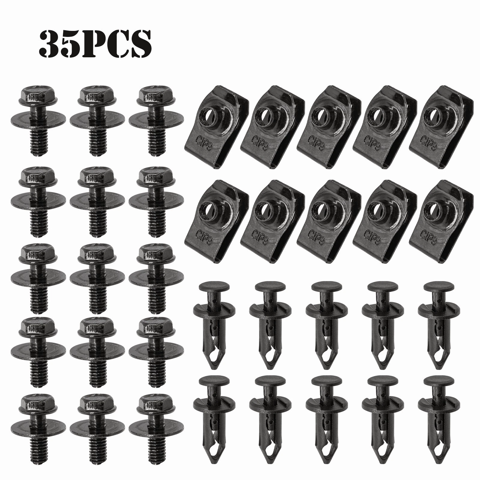 Feature: Premium Carbon Steel & Plastic: Engine Undertray Clips Screws are made of high-quality carbon steel material, which is not easy to rust, anti-oxidation, anti-vibration, strong and wear-resistant, the screw thread are clear and smooth, and the U-shaped spring clip has good elasticity and durable. Easy to Use and Replace: easy and quick to install, easy to replace damaged parts, less time and effort than going to the local garage to replace the retaining clips, lightweight and saving space, easy to carry and replace in time on the go. Specification: Item Type: Fastener & Clip Material: metal, plastic Color: Black Size: as picture shows Please confirm model and size before ordering! Package includes: 10pcs Extruded U-nuts 15pcs Body Bolts with Built-in Fender Washer 10pcs Nylon Push Clips