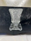 This is an unmarked Bohemian Crystal vase made of clear crystal in a pressed glass production style. The vase has a traditional Bohemian design with intricate patterns and a high-quality craftsmanship, perfect for displaying fresh flowers or as a standalone decorative piece.
