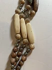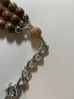 This Boho Bead Belt is designed for women and features a wide brown belt adorned with round metal beads. The belt is made of beads in a brown and cream wood color scheme, giving it a unique and stylish look. Measuring 34 inches in length and 1.5 inches wide, this belt is a fashionable accessory that can add a touch of bohemian flair to any outfit.