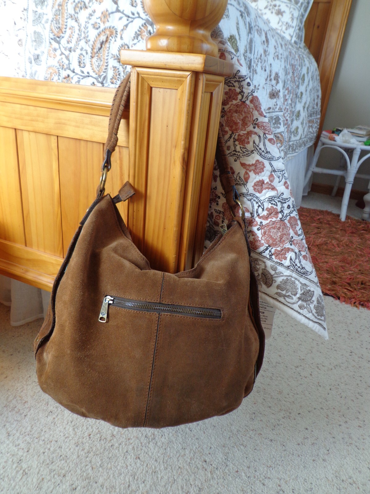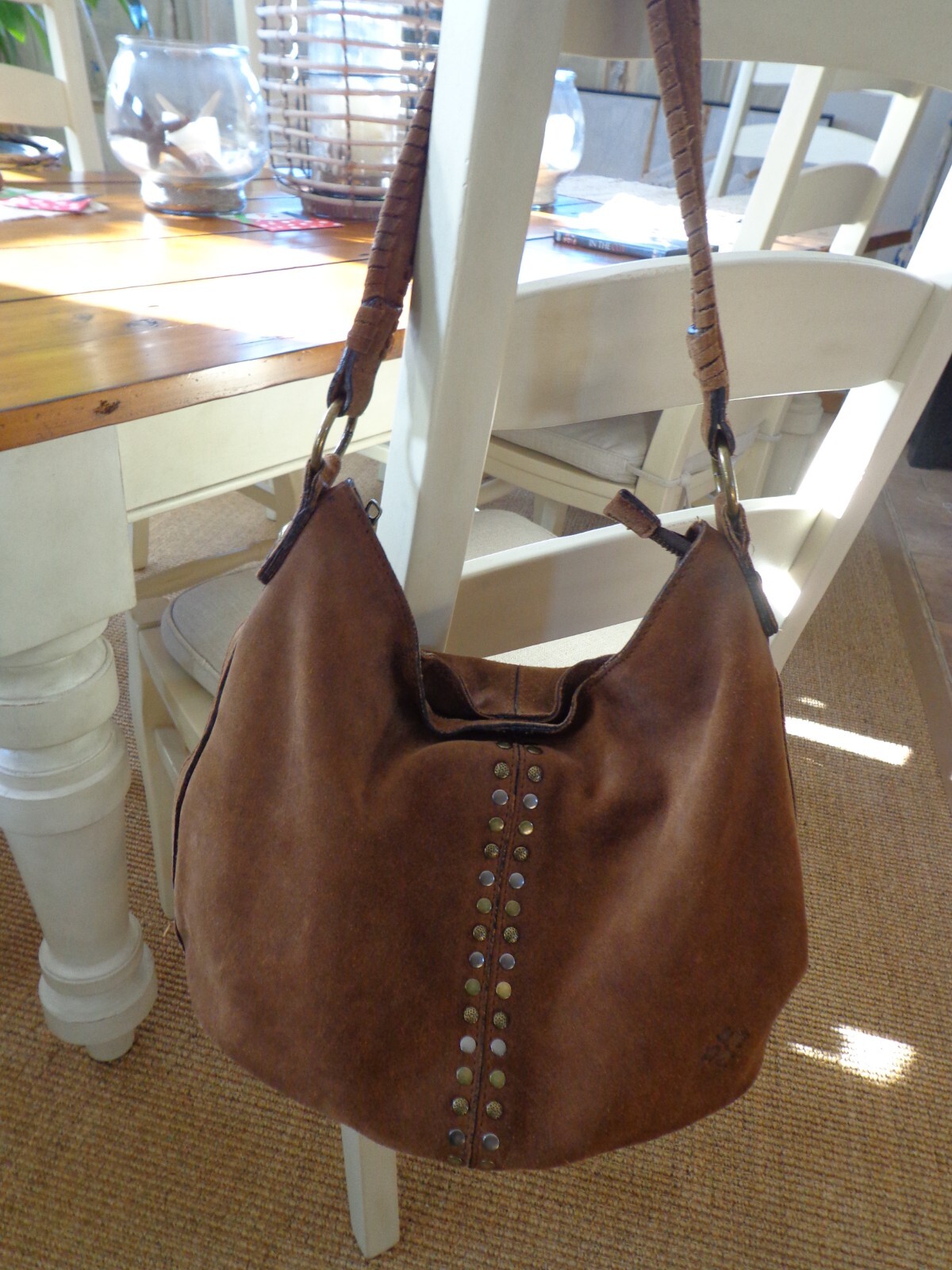 Patricia Nash Boho Handbag Retail $298 Material: 100% Genuine Leather (Suede) Color: Brown Measurements: 16” W. x 13” H. — 13” strap drop Zip closure Whipstitch handle Studded embellishment Pockets galore! — Outer zip pocket, hidden side pockets on both sides (zip closures), inside pocket zip closure, 2 inside open pockets Durable suede interior VERY CLEAN! Patricia Nash inside logo Patricia Nash outer stamped logo Slightly pleated bottom (see pics) Spacious I tend to buy handbags & only use them for a brief period, just as many of my other things. This bag is in very nice pre-loved condition. No Returns