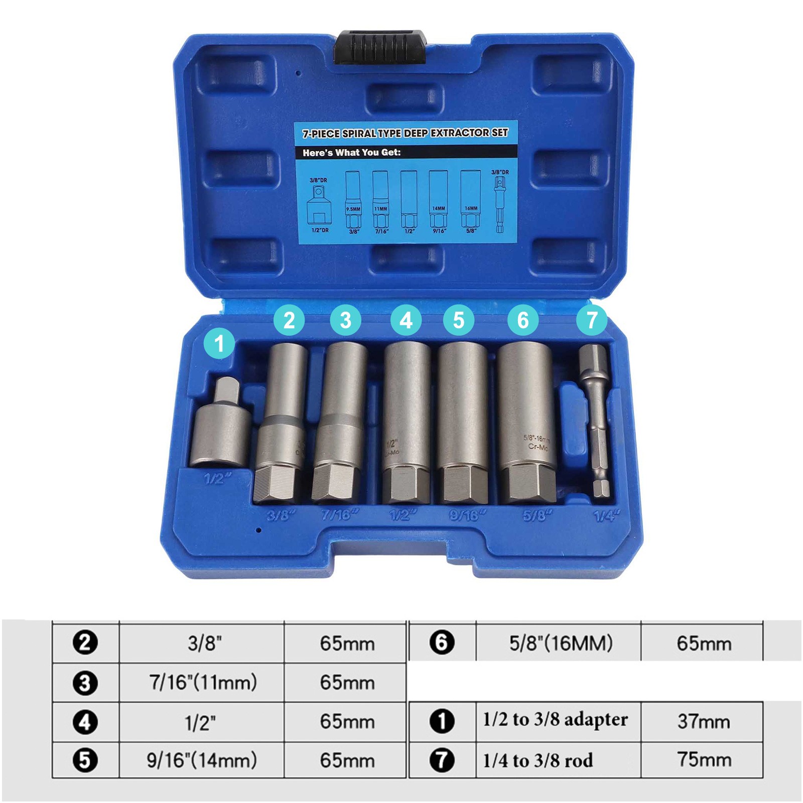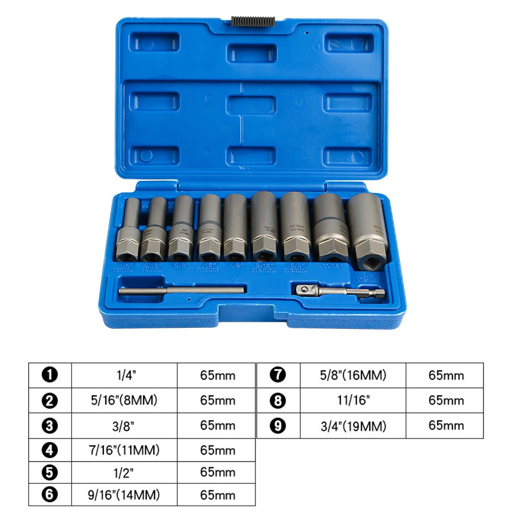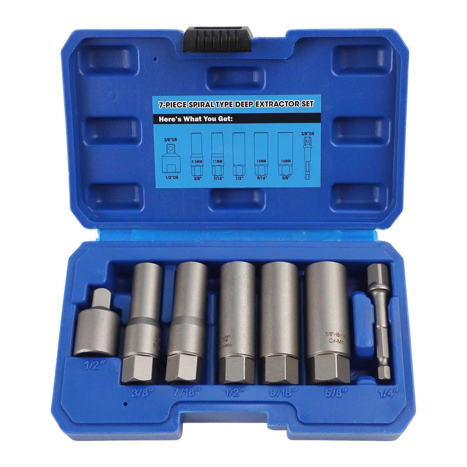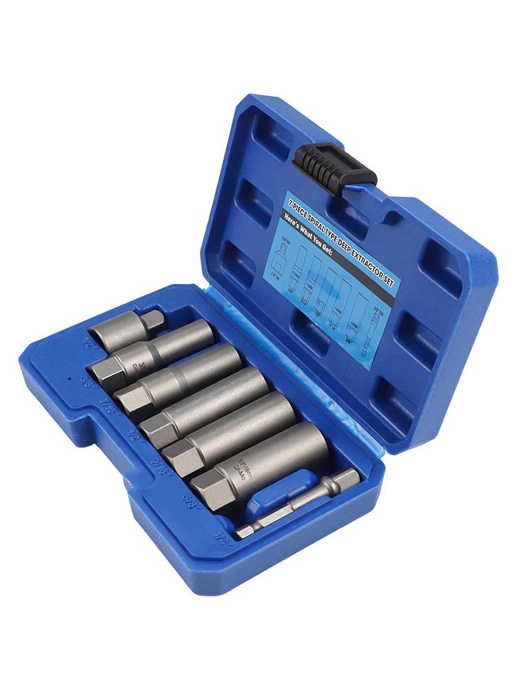 Product Description Features: Assists in the removal of rounded nuts/bolts Special reverse type thread Spiral cut teeth for positive grip Deep design passes over long studs etc 3/8" Drive wrench across the flats Specifications: Product name:Deep Socket Set Extractor Sizes:1/4" 8mm(5/16") 10mm (3/8") 11mm (7/16") 13mm (1/2") 14mm (9/16") 16mm (5/8") 11/16" 19mm(3/4") Length:65mm Meterial:Cr-Mo Steel construction Color:grey Type:3/8" Drive Box size:210*143*57mm Package content: 7PCS/set Socket drive or 11PCS/set Socket driver Notes: 1. Due to manual measurement, please allow 1-3mm error. 2. Due to the difference of different monitors, the picture may not reflect the actual color of the item. Payment Payment must be completed within 5 days. If you have any problems about payment, please contact us via ebay message. Delivery details We only ship to confirmed ebay Order addresses. Please comfirm that your Order address is in line with your shipping address. Please kindly note that the combined shipping is not provided because the shipping fee is calculated by weight. Also, the each additional item means exactly the the same color and size. It takes about 7-15 working days to Australia; about 10-30 working days to other countries. Transit time may be a little delayed because of the bad weather and customs inspection. If you do not receive your item within 30 working days since payment finished, please contact us immediately for further assistance. Contact us We strive for 100% customer satisfaction! Positive Feedback is very important to us. If you have any questions, please feel free to contact us via "Ask seller a question" . We will reply your email within 24 working hours.