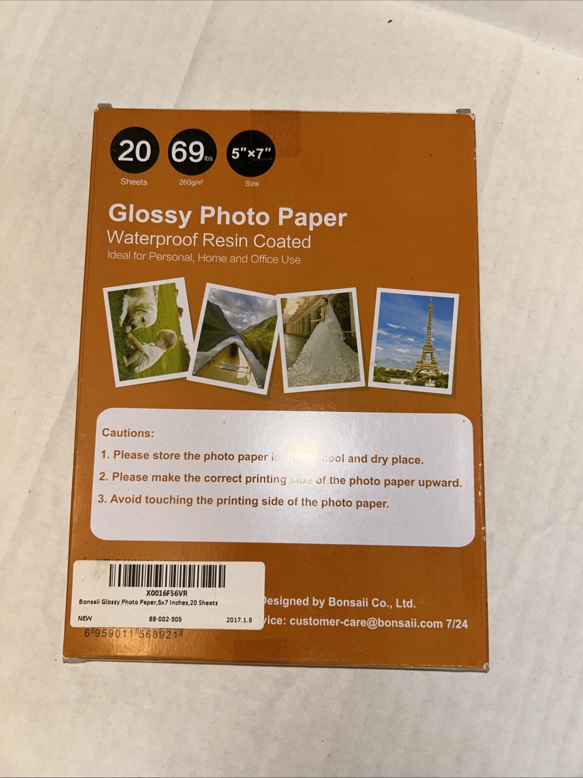 The Bonsaii Printer Glossy Photo Paper is designed for HP printers and comes in a pack of 20 sheets sized at 5 x 7 inches. The paper has a high-gloss finish with a waterproof resin coating, making it ideal for printing vibrant and long-lasting photos. Compatible with the TR8520 model, this inkjet photo paper ensures colorful and detailed prints suitable for various printing needs.