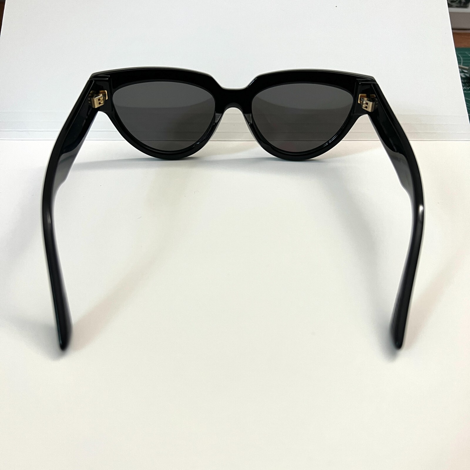 Bottega Veneta Black Cat-Eye Sunglasses. Pre-owned in like new condition Cat-eye acetate-frame sunglasses in black. · Gray lenses · Integrated nose pads · Logo hardware at temples · Exposed core wires · Logo engraved at temple · Gold-tone hardware · Soft woven case with snap included · Size: 55.19 145 Supplier color: Black Acetate Made in Japan.
