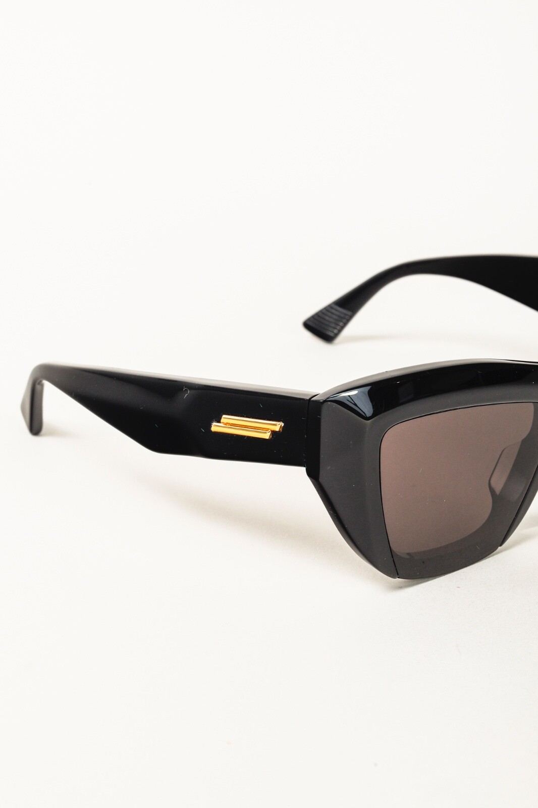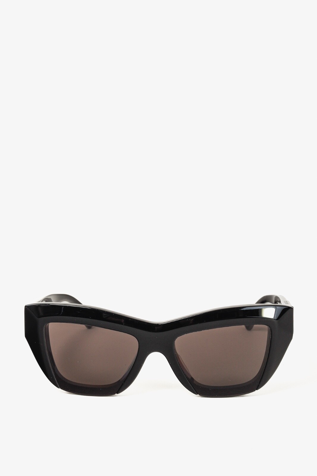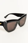 Experience timeless elegance with the Bottega Veneta Black Acetate Sunglasses BV1218S 001. These feminine cat-eye sunglasses feature faceted profiles and flash lenses for a rich effect. Made from recycled acetate in Italy, they are both stylish and sustainable. The iconic metal fringed ribbon on the temple adds a touch of sophistication. A must-have for the modern woman. Condition: Excellent, minor scratches along brow of frame, smudges that may be wiped off along temples and arms; includes box, product cards, manufacturer information document, microfibres cloth Approximate Measurements: Height: 2" (5 cm) Width: 5.75" (15 cm) Arm Length: 5.5" (14 cm) Composition: acetate, plastic