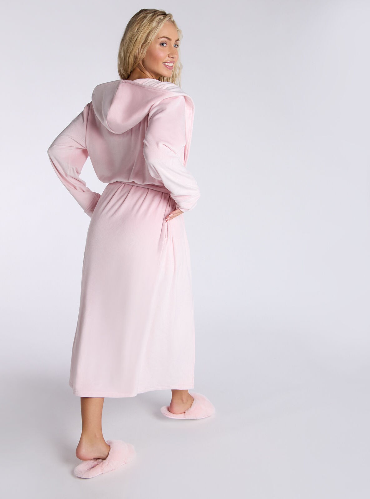 Luxuriously soft and undeniably stylish - discover your perfect dressing gown featuring super soft velour fabric for extra cosiness! Dressing gown Long-length Super soft velour material Contrast piping detail Belted with pockets Hood for extra comfort Complete the look with our velour lounge set and fluffy socks or slippers