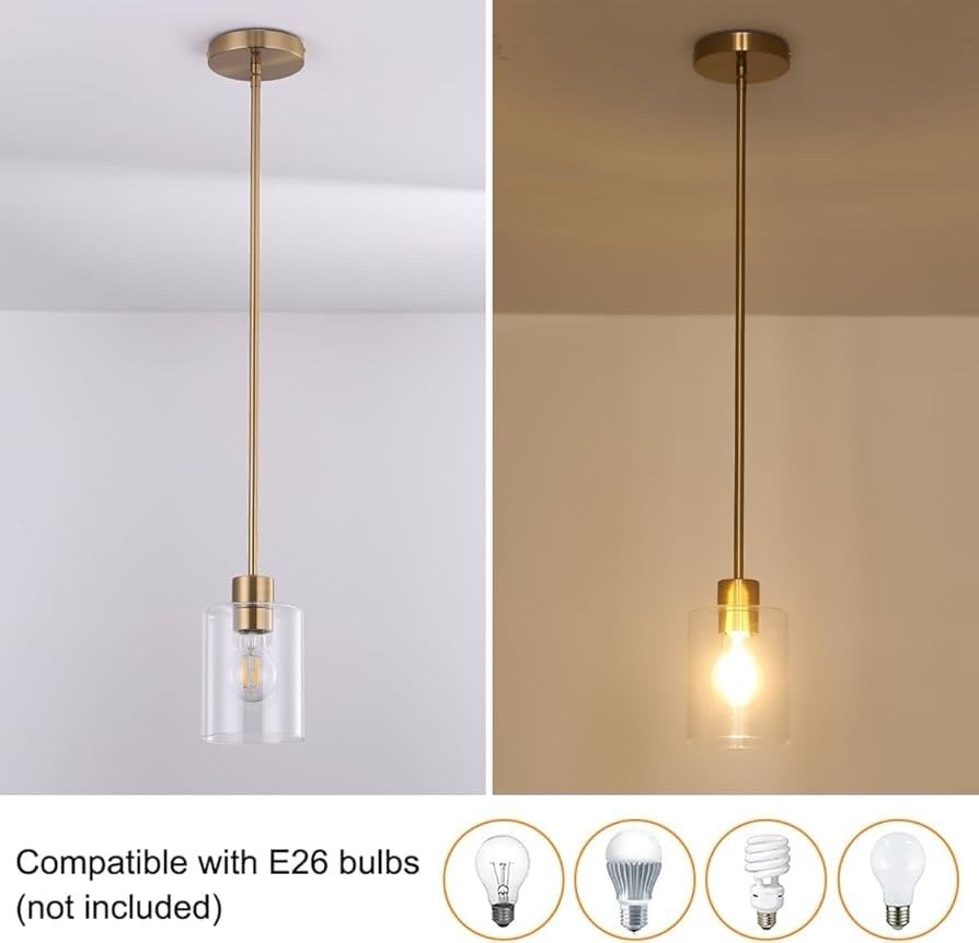Brass Pendant Lights Gold Clear Glass Pendant Light Fixture 3 Units 12 Inch 3 Units 4 Inch 3 Pack, Kitchen Island, Multiple Stems, Rods KLSS Modern Farmhouse Pendant Lights – Brass Rod 3PK, Clear Glass Shades, Adjustable Height Bring modern farmhouse elegance into your home with this set of 3 KLSS brass pendant lights. Designed with threaded brass rods, clear glass shades, and solid aluminum lamp holders, these pendants deliver a sleek, stylish, and versatile look that fits perfectly over kitchen islands, sinks, dining areas, and more. Features & Benefits • Adjustable Downrods: Comes with threaded stiff poles in multiple lengths and a tilting swivel canopy for flat, vaulted, or sloped ceilings up to 54” high. • Solid Construction: High-end aluminum lamp holder with brushed finish for durability and a clean, modern design. Standard round mounting bracket allows for easy installation. • Clear Glass Shade: Wide opening for simple cleaning. Includes gloves to prevent fingerprints during installation. • Bulb Compatibility: Works with any E26 base bulb (LED, incandescent, or Wi-Fi smart bulbs). The fixture itself is not dimmable, but compatible with dimmable bulbs + dimmer switches. • Versatile Applications: Perfect for kitchen islands, bathrooms, hallways, stairways, entryways, dining rooms, bedrooms, restaurants, and more. Specifications • Brand: KLSS • Color: Brass rod (3 Pack) • Style: Modern Farmhouse • Light Fixture Form: Pendant • Material: Aluminum, Glass, Metal • Finish Type: Brushed • Shade Material: Clear Glass • Room Type: Bathroom, Hallway, Kitchen, Over Sink, Island • Usage: Indoor use only • Item Dimensions (L x W x H): 4.72” x 4.72” x 56” Safety & Care • For indoor use only • Cut off electricity before installation or bulb replacement • Do not connect electricity until fixture is fully assembled • Use in dry environments for longest lifespan • Allow bulb to cool before touching or replacing Create a warm, inviting ambiance with these modern farmhouse brass pendant lights—a perfect blend of style, durability, and functionality.