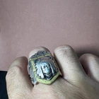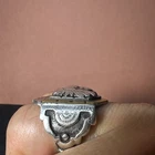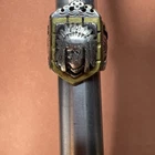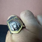 This product is a unique ring made with a combination of brass and sterling silver, featuring an Aztec Indian Chief design that gives it a statement style. The ring is in size 9.25, making it suitable for most fingers. With its intricate detailing and use of high-quality metals, this piece would make a bold accessory for any Mexican biker or Aztec enthusiast looking to add a touch of tribal flair to their jewelry collection.